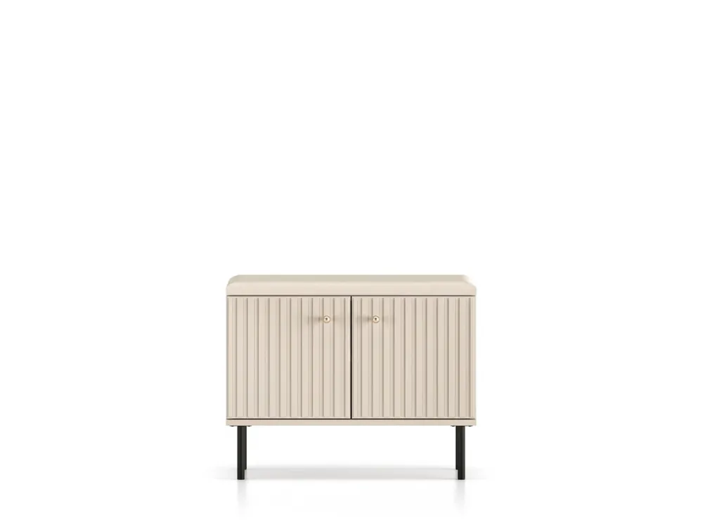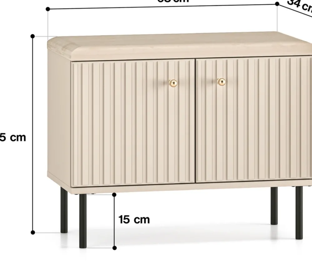- Szafka na buty SOPHIE kaszmirowa o szerokości 68 cm to kompaktowy mebel do małych wnętrz. Frezowane fronty MDF, złote uchwyty i czarne nóżki 15 cm łączą styl z funkcjonalnością, zapewniając eleganckie i praktyczne przechowywanie obuwia w przedpokoju.