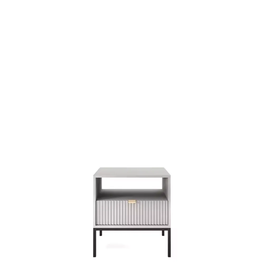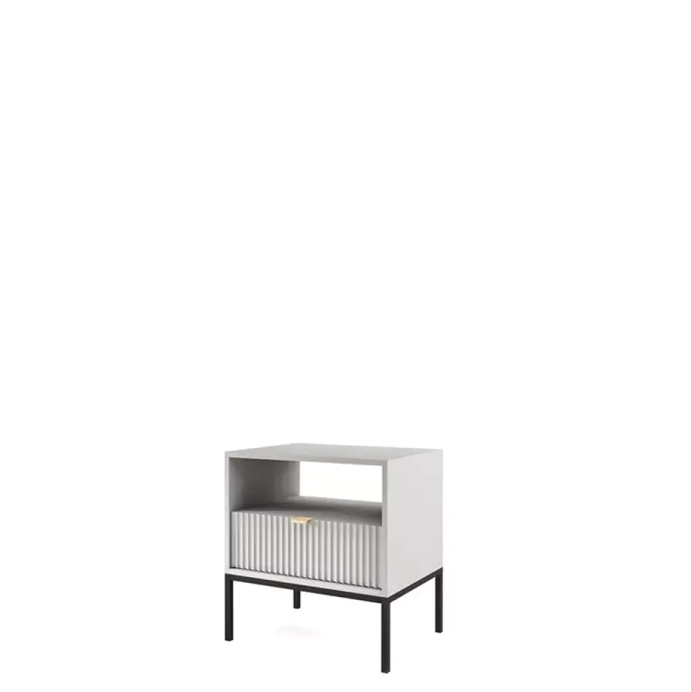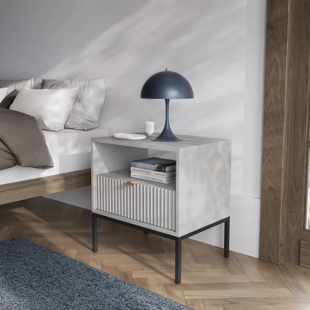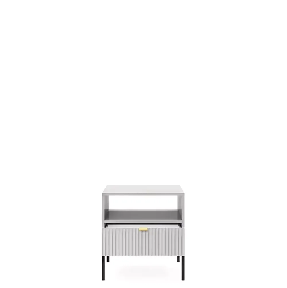 Szara szafka nocna AVANTI na czarnych nóżkach może być inspiracją do stworzenia wymarzonej sypialni. Przepiękny ryflowany front i gładka płyta laminowana, której użyto do wykonania korpusu, wkomponują się w większość styli wnętrzarskich. Uroku nadaje tej szafce nie tylko front szuflady, ale też złoty uchwyt, dzięki któremu łatwo dostaniesz się do przedmiotów w niej umieszczonych. Nawet tych najgłębiej skrytych, ponieważ szafkę wyposażono w prowadnice kulkowe z pełnym wysuwem. Szafka ma blat o wymiarach 54×39 cm, więc bez problemu zmieści się na niej lampka nocna, książka oraz szklanka wody.