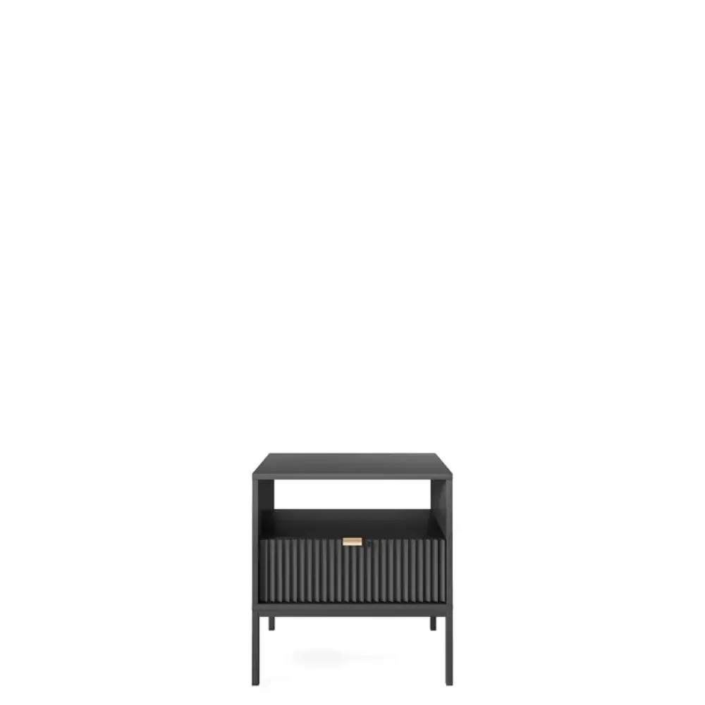 Czarna szafka AVANTI na metalowych nóżkach może być inspiracją do stworzenia wymarzonej sypialni. Przepiękny ryflowany front i gładka płyta laminowana, której użyto do wykonania korpusu, wkomponują się w większość styli wnętrzarskich. Uroku nadaje tej szafce nie tylko front szuflady, ale też złoty uchwyt, dzięki któremu łatwo dostaniesz się do przedmiotów w niej umieszczonych. Nawet tych najgłębiej skrytych, ponieważ szafkę wyposażono w prowadnice kulkowe z pełnym wysuwem. Szafka ma blat o wymiarach 54×39 cm, więc bez problemu zmieści się na niej lampka nocna, książka oraz szklanka wody.