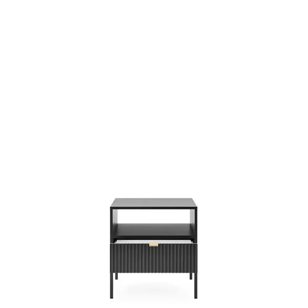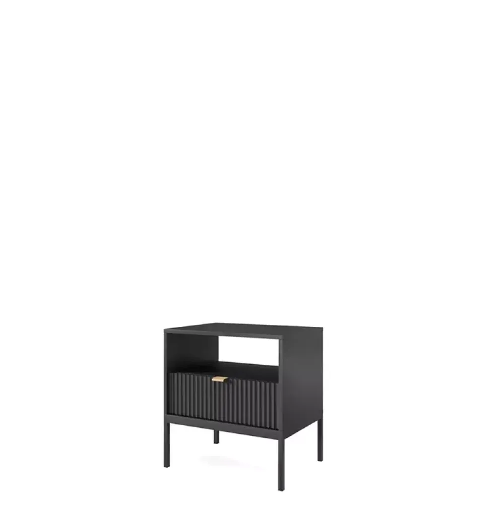 - Szafka nocna AVANTI do sypialni ma ryflowany front, złoty uchwyt i czarne, metalowe nogi. Wpasuje się w aranżację w stylu glamour oraz nowoczesną. Ten elegancki stolik nocny ma 54 cm szerokości i oprócz półki pod blatem ma także szufladę.
