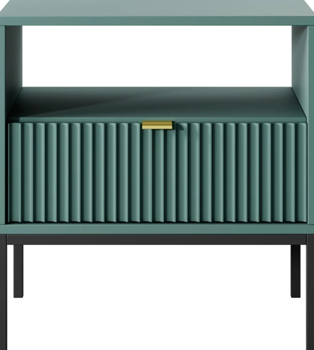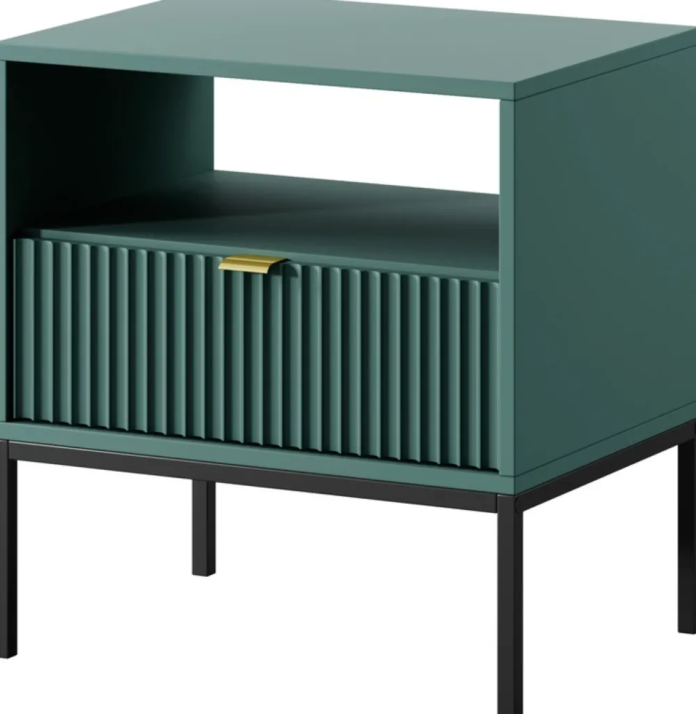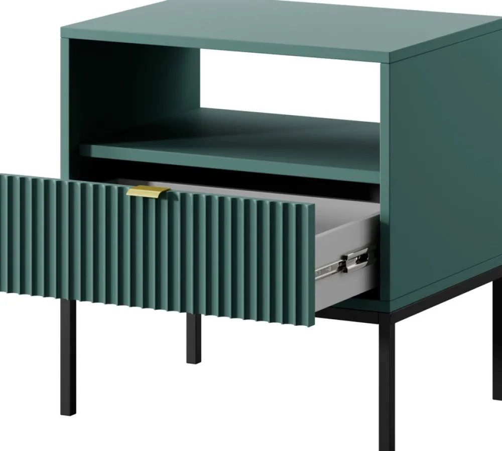 - Szafka nocna AVANTI została wyposażona w pojemną szufladę, którą osadzono na prowadnicach kulkowych. Szafka nocna posiada metalowe nogi umożliwiające odkurzanie pod szafką, oraz aluminiowy uchwyt w złotym kolorze.