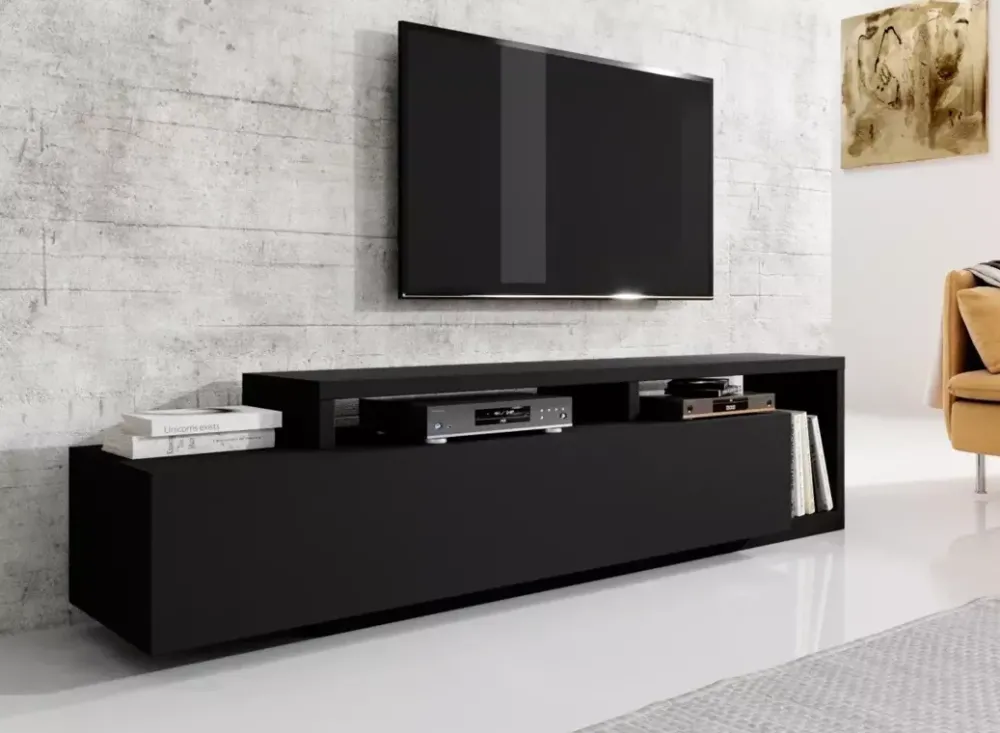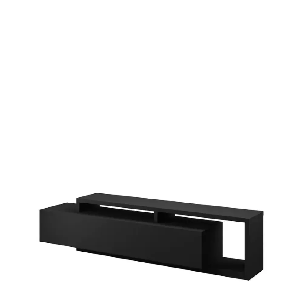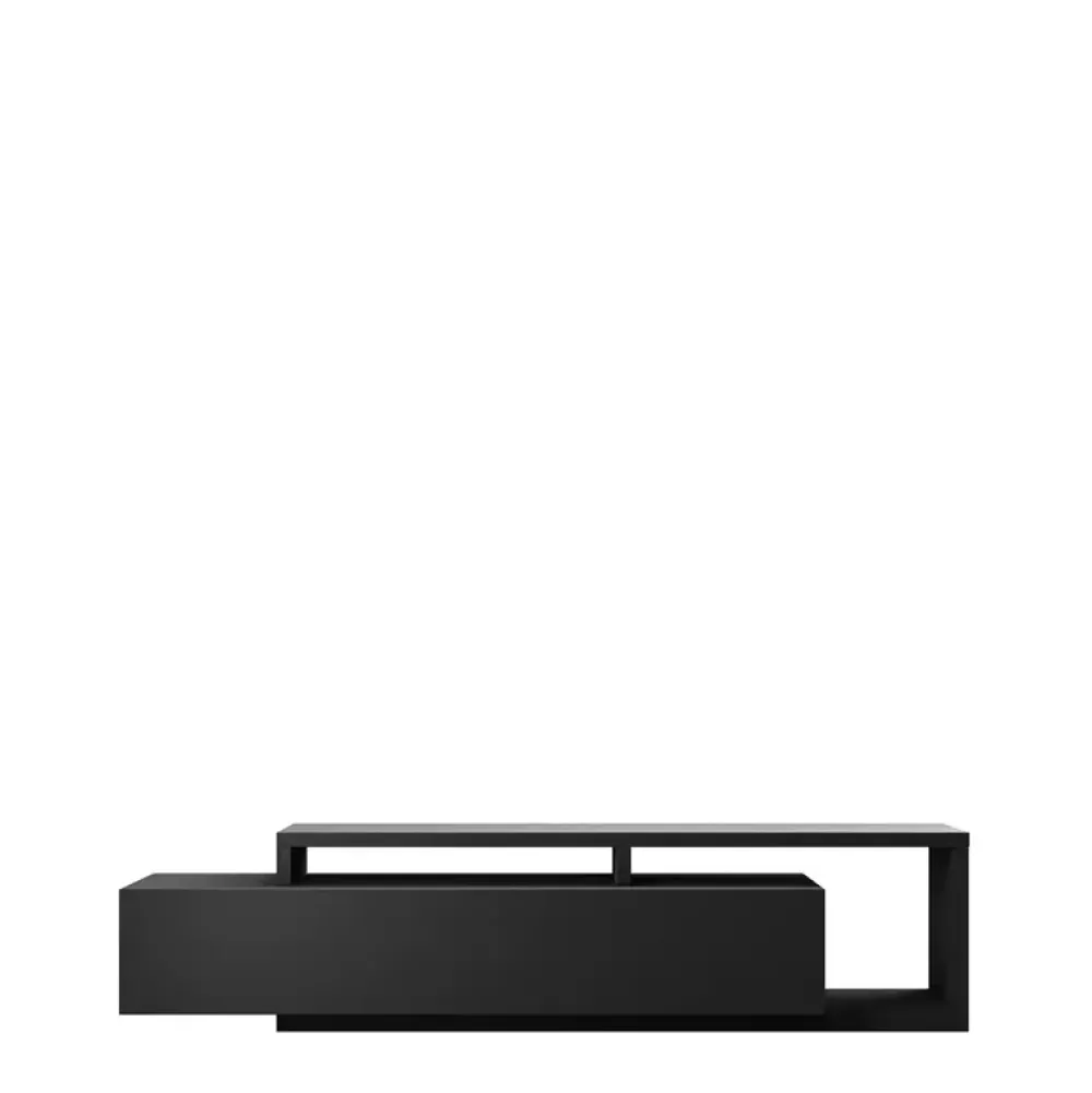 Elegancka szafka rtv w asymetrycznych kształtach o szerokości 219 cm wyposażona w pojemną szufladę oraz półki.