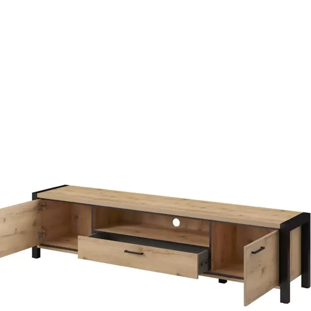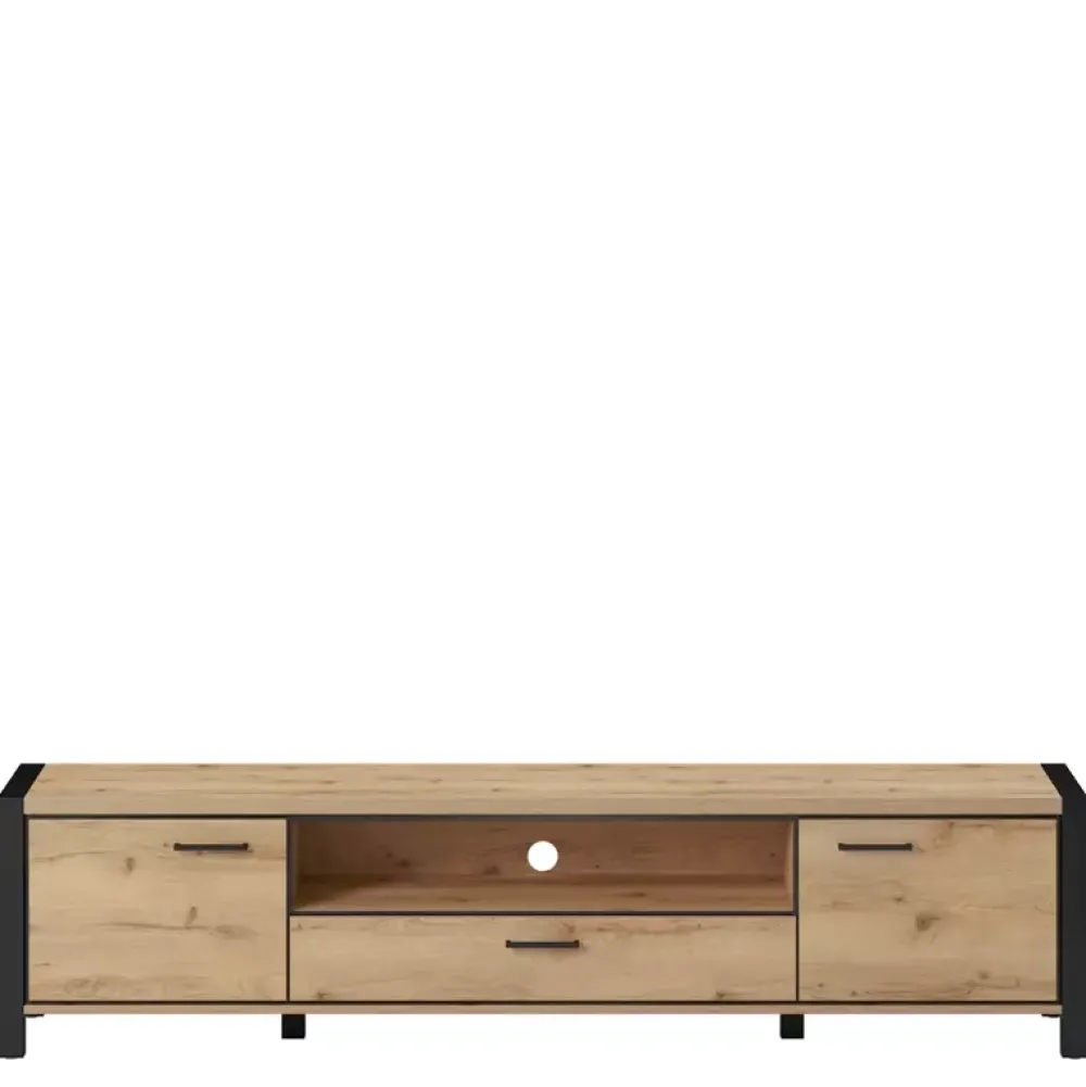 Szafka RTV ANGELINO została wyposażona w drzwi po lewej i prawej stronie, za którymi znajdziesz przestrzeń pozwalającą przechować przedmioty, które chcemy ukryć przed światłem dziennym. Natomiast w centralnej części szafki swoje miejsce odnalazła szuflada osadzona na prowadnicach kulkowych z pełnym wysuwem oraz wnęka z otworem na kable, dzięki któremu doskonale sprawdzi się do umieszczenia dekodera.