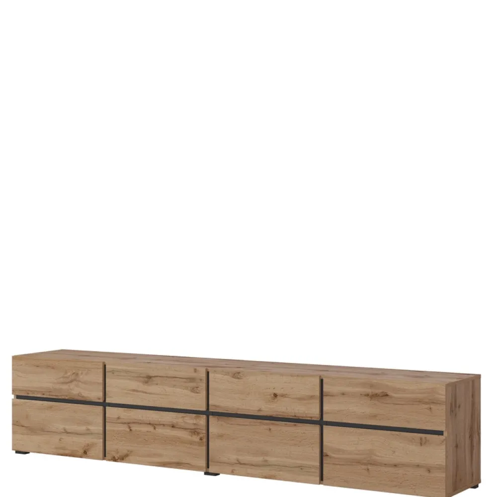 - Nowoczesna szafka RTV CROSS o szerokości 255 cm posiada cztery szuflady oraz cztery drzwi. Zapewni to sporo miejsca na multimedialne akcesoria. Szafka RTV wykonana została w całości z płyty laminowanej, a jej obrzeża zabezpieczone są okleiną ABS.