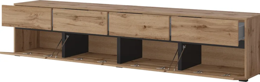 Nowoczesna szafka RTV pod telewizor jest wyposażona w cztery pojemne szuflady oraz cztery uchylne drzwi, co oferuje mnóstwo miejsca do przechowywania. Możesz w niej umieścić różnorodne sprzęty RTV, kolekcje filmów, książki czy inne przedmioty, które chcesz mieć pod ręką w salonie. Dzięki przemyślanemu układowi wszystkie Twoje rzeczy będą zawsze schludnie uporządkowane i łatwo dostępne.