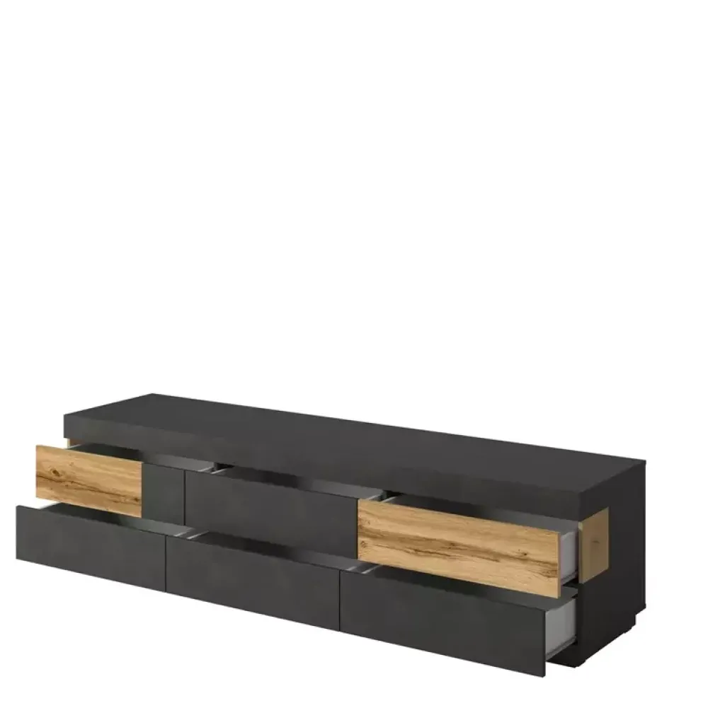- Pojemna szafka rtv o szerokości 206 cm z sześcioma szufladami.