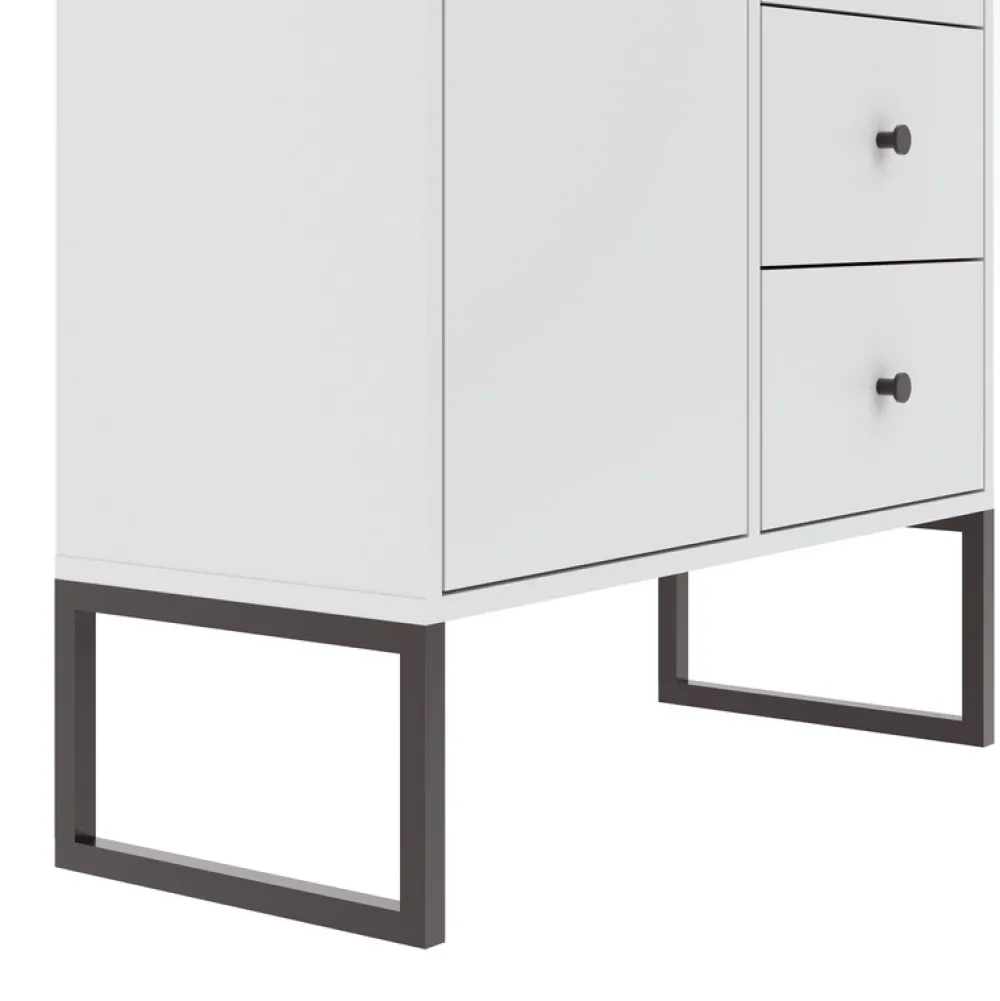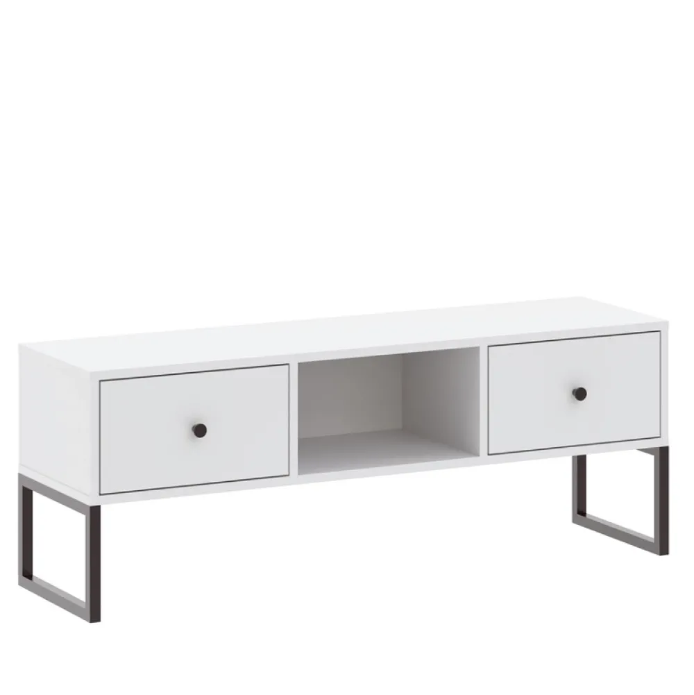 - Biała szafka RTV LAMORI 115 cm z 2 szufladami i otwartą półką. Metalowe uchwyty i nóżki, trwała płyta laminowana. Idealna pod telewizor do 50″ – funkcjonalny i stylowy mebel do nowoczesnego salonu.