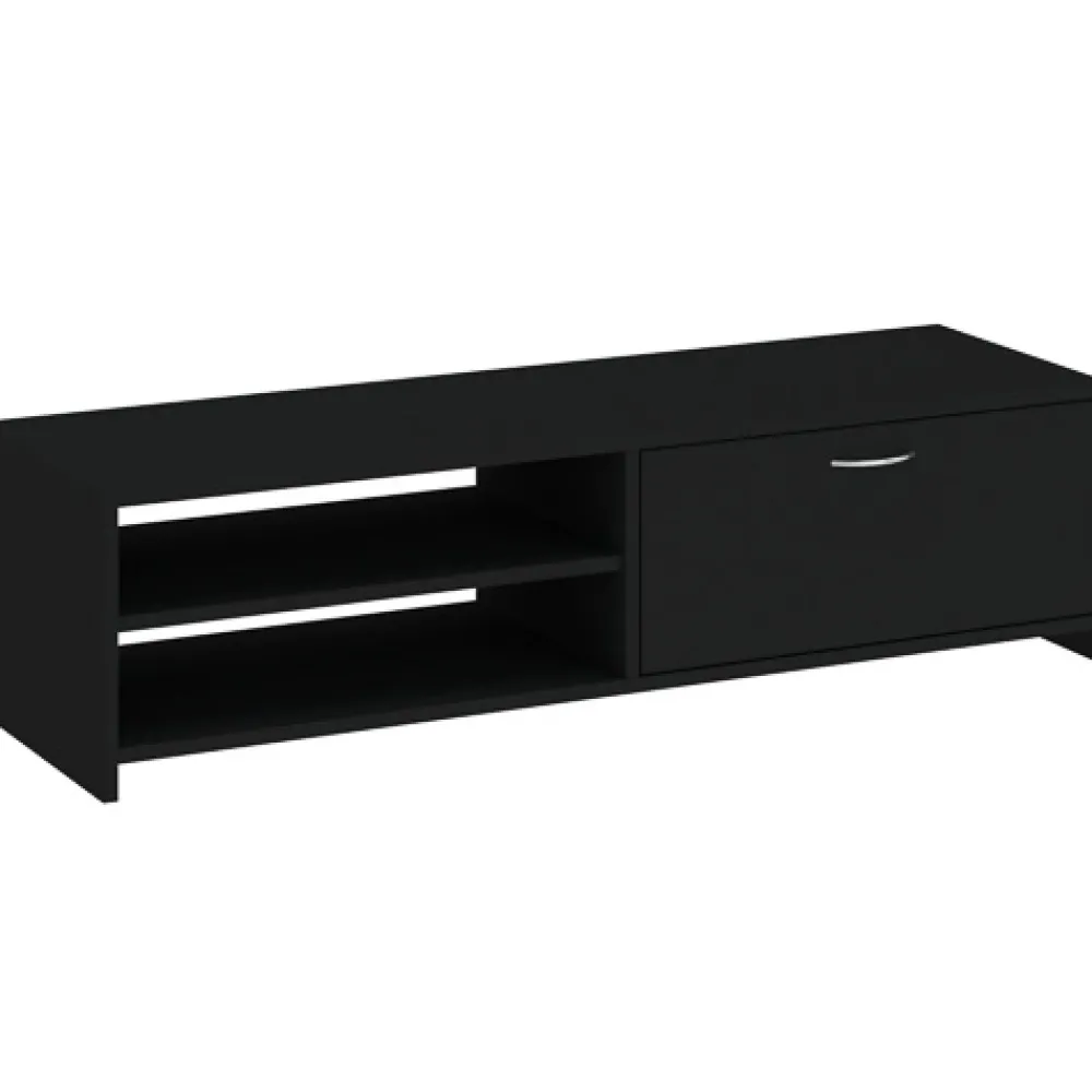 - Szafka RTV CORTA 120 cm w czarnym macie to idealne rozwiązanie do małych salonów. Zmieści telewizor do 43 cali, ma pojemne szuflady na prowadnicach kulkowych i nowoczesny, minimalistyczny design pasujący do współczesnych wnętrz.