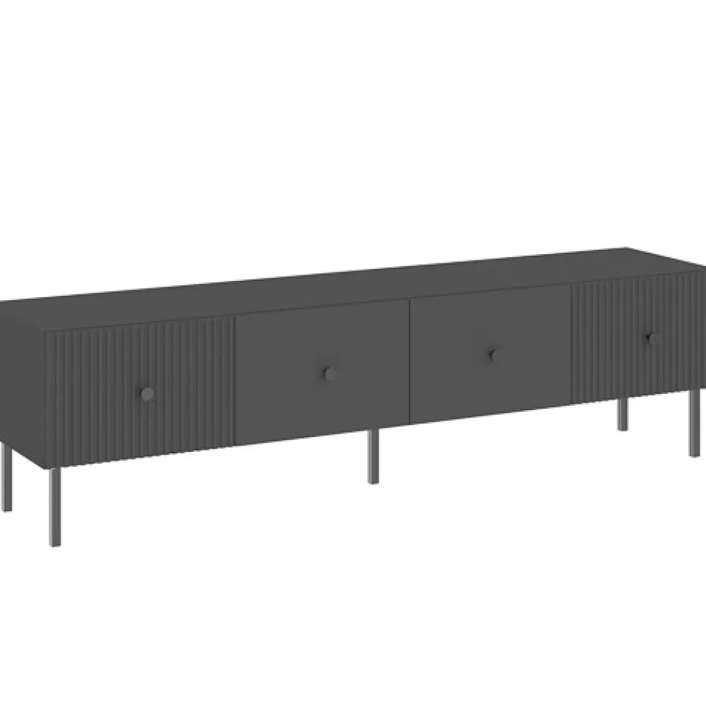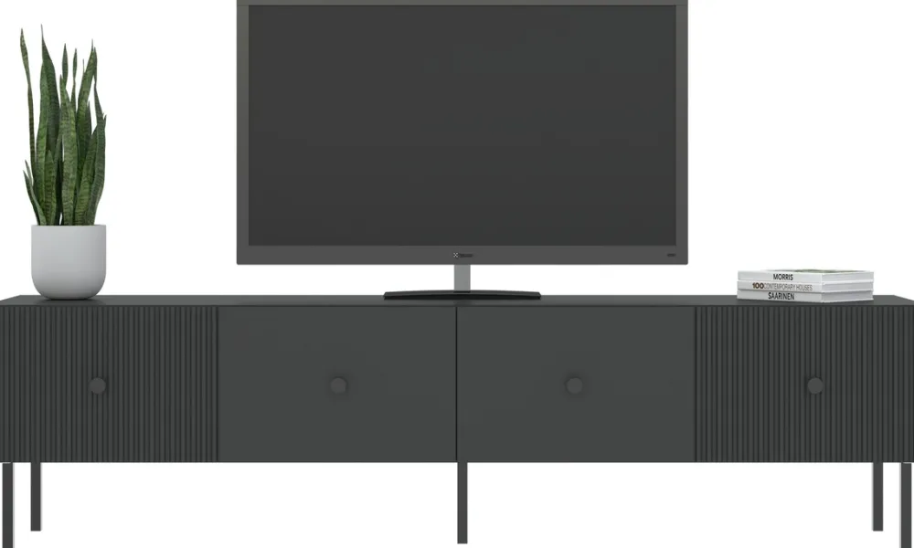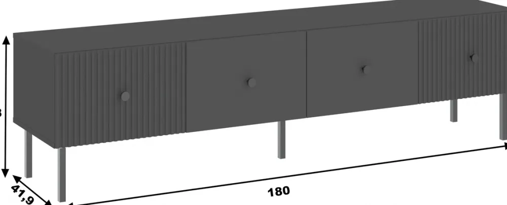 Szafka RTV 180 cm VALTEO to stylowe połączenie nowoczesnej estetyki z praktycznymi rozwiązaniami. Czarna kolorystyka oraz dekoracyjne lamele na frontach tworzą wyrafinowany mebel, który doskonale dopełni wystrój pokoju dziennego. Dzięki przemyślanej konstrukcji szafka nie tylko podkreśla charakter wnętrza, ale także zapewnia funkcjonalną przestrzeń do przechowywania sprzętu i akcesoriów RTV.