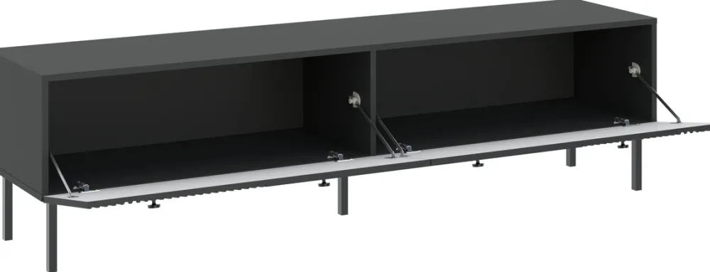 - Szafka RTV VALTEO 180 cm w czerni z lamelami to elegancki mebel do nowoczesnego salonu. Zapewnia miejsce na sprzęt, ukrywa przewody i zachwyca designem. Idealna do stylu modern glam lub loft.