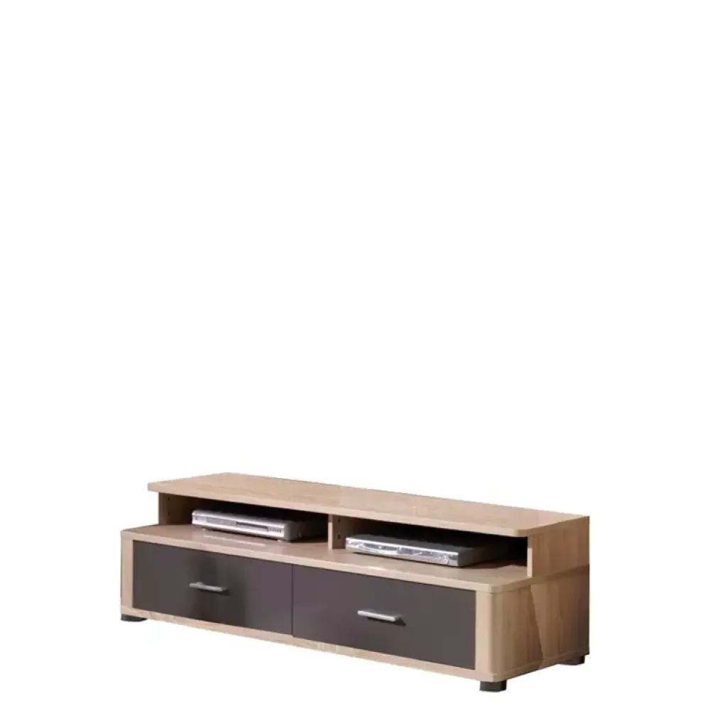 - Szafka RTV o szerokości 153 cm została wyposażona w dwie szuflady, w których zastosowano prowadnice kulkowe z pełnym wysuwem oraz dwie półki tuż nad nimi.