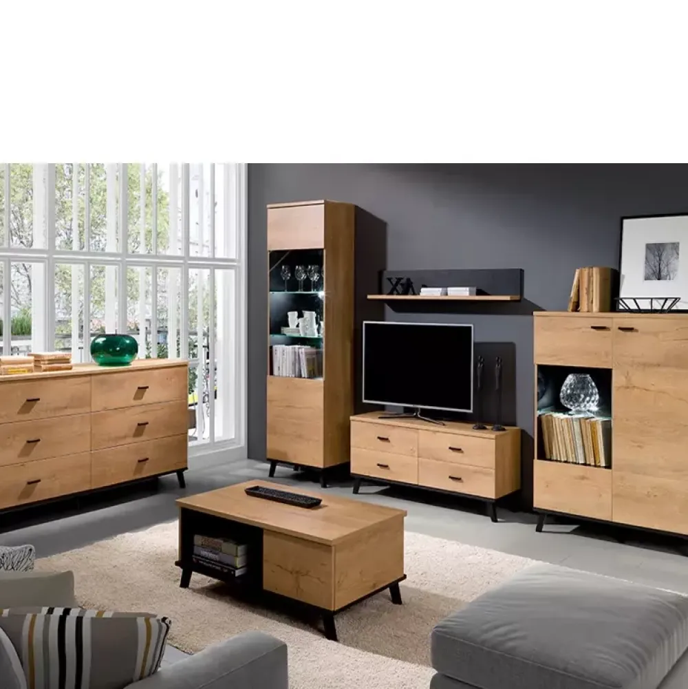 Minimalizm to pierwsze co przychodzi na myśl o nowoczesnych meblach do salonu. Kolekcja JOHNY to połączenie funkcjonalności i eleganckiej formy z prostotą, więc swoje miejsce powinna odnaleźć we wnętrzu tropiciela trendów. W kolekcji tych ponadczasowych mebli systemowych znajdują się bryły, które pomogą Ci uporządkować wszystkie potrzebne przedmioty; duża szafa, witryny szklane, barki, szafki RTV, półki wiszące oraz stoliki kawowe. Elementy wykonywane są z wysokiej jakości płyty laminowanej, której odcień wprowadzi do wnętrza salonu ciepły i nastrojowy klimat.