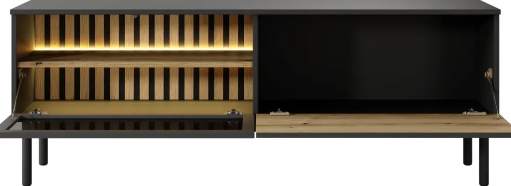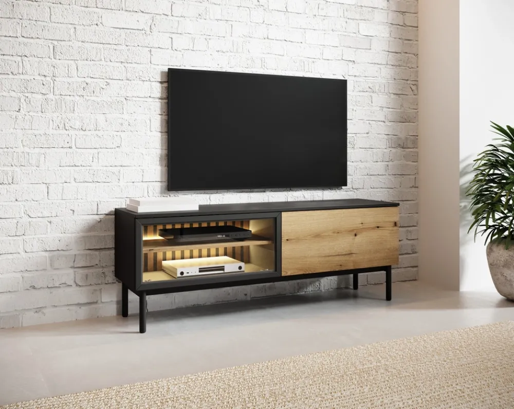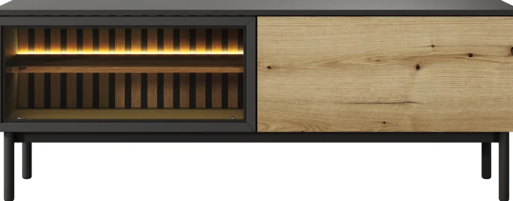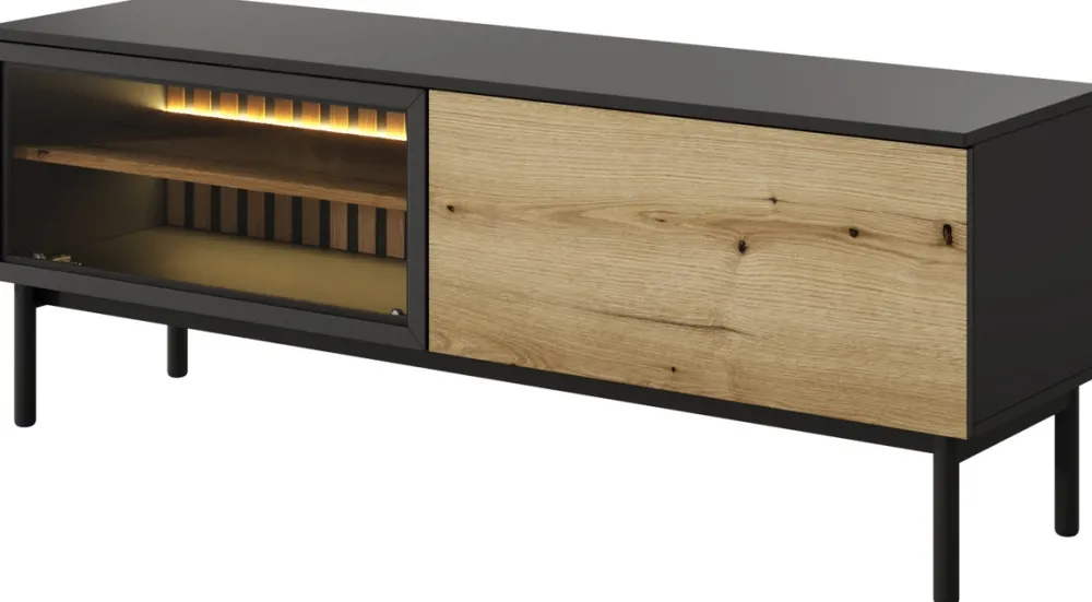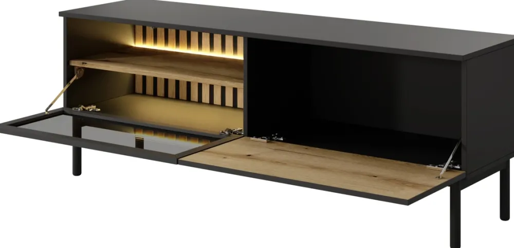 - Szafka RTV 150 cm LARINO oparta została na wysokich drewnianych nogach w kolorze czarnym. Loftowa szafka RTV posiada dwoje uchylnych drzwi, z których jedne są przeszklone. W zestawie z szafką RTV znajduje się oświetlenie LED.