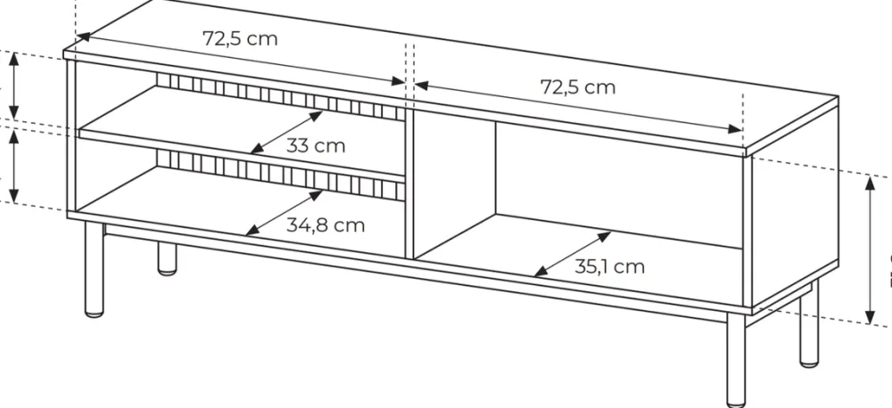 Wysokie drewniane nóżki nadają szafce RTV na nóżkach stabilności i dodają jej loftowego klimatu, a także ułatwiają sprzątanie pod meblem. Wnętrze szafki jest równie przemyślane – trzy półki, oferują praktyczne miejsce do przechowywania sprzętu RTV oraz innych akcesoriów, pomagając utrzymać porządek i estetykę w salonie.