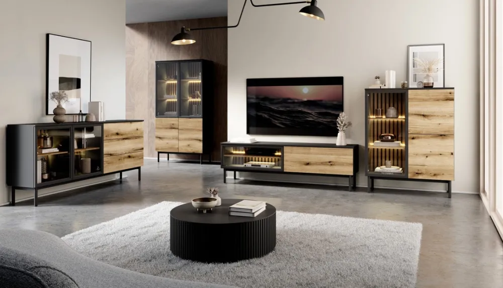 Dodatkowym atutem jest oświetlenie LED w ciepłym, białym odcieniu, które podkreśla elegancję wnętrza, tworząc przytulny nastrój i efektownie eksponując zawartość półek. LARINO to loftowa szafka RTV, która łączy styl i funkcjonalność, doskonale wpisując się w każde nowoczesne wnętrze. Przekonaj się sam już teraz jak jeden mebel, może odmienić chwilę w Twoim salonie!
