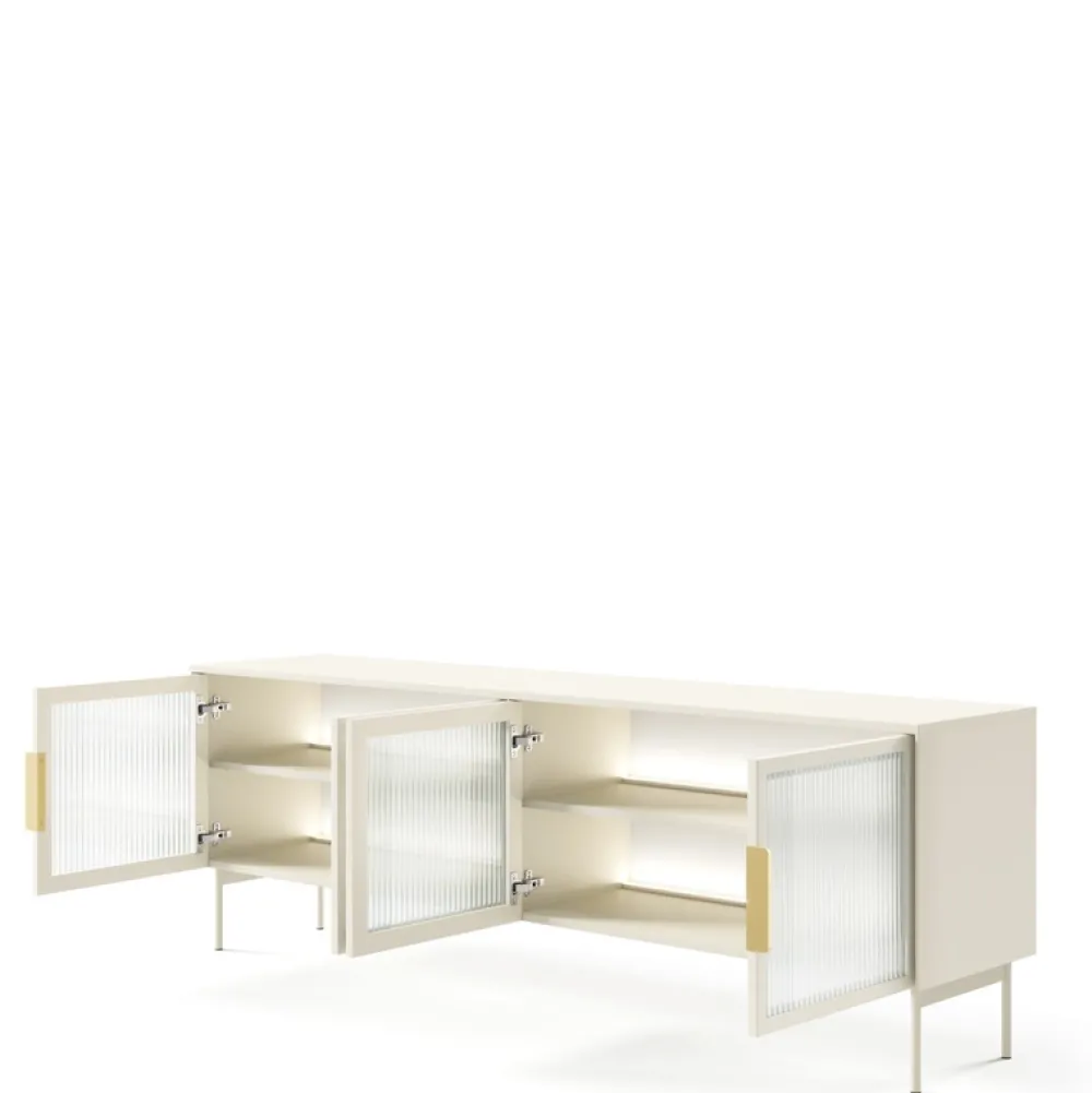 - Szafka RTV LUANO 181 cm w kolorze kaszmir to elegancki mebel z czterema przeszklonymi frontami ze szkła flutes, wbudowanym oświetleniem LED i złotymi uchwytami. Idealna do nowoczesnego salonu, łączy funkcjonalność z wyrafinowanym designem.