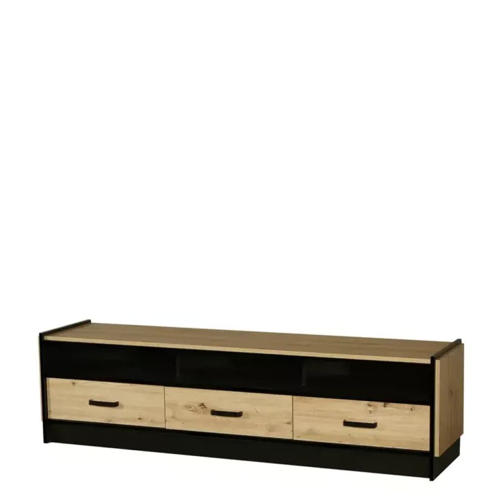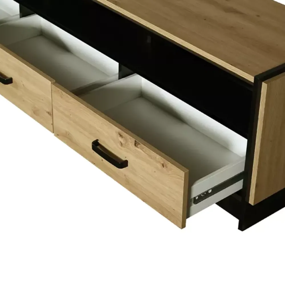 Szafka RTV KALETTO posiada 180 cm szerokości, które pozwalają na umieszczenie dużego telewizora oraz rozmaitych dodatków. Nowoczesna szafka RTV została wyposażona w trzy pojemne szuflady, w których z pewnością swoje miejsce odnajdują albumy rodzinne oraz inne przedmioty. Dodatkowo obrzeża szafki RTV do salonu odpowiednio zabezpieczono przed uszkodzeniami mechanicznymi okleiną PCV, Natomiast kolorystyka oraz nowoczesna stylistyka szafki RTV sprawia, że doskonale odnajduje się ona we współczesnych aranżacjach salonów.