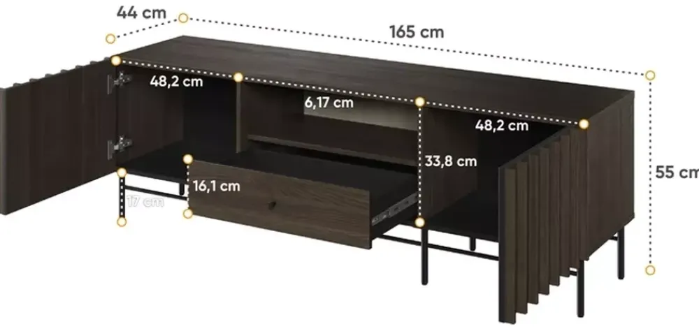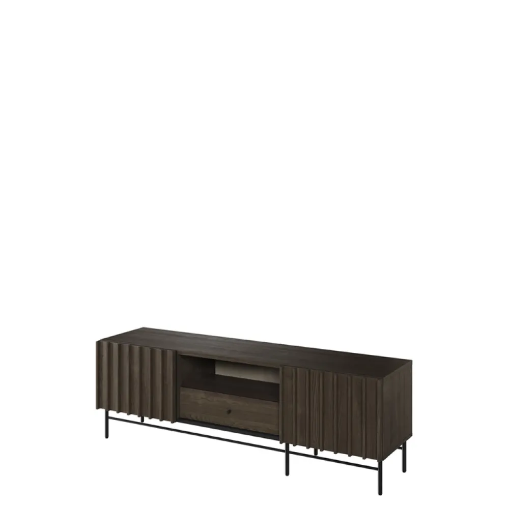 Nowoczesna szafka RTV na wysokich nóżkach PIEMONTE z lamelami to doskonałe połączenie stylu i funkcjonalności. Wykonana z trwałej i atrakcyjnej płyty laminowanej, szafka wytrzyma codzienną eksploatację, zachowując swoją elegancką estetykę.