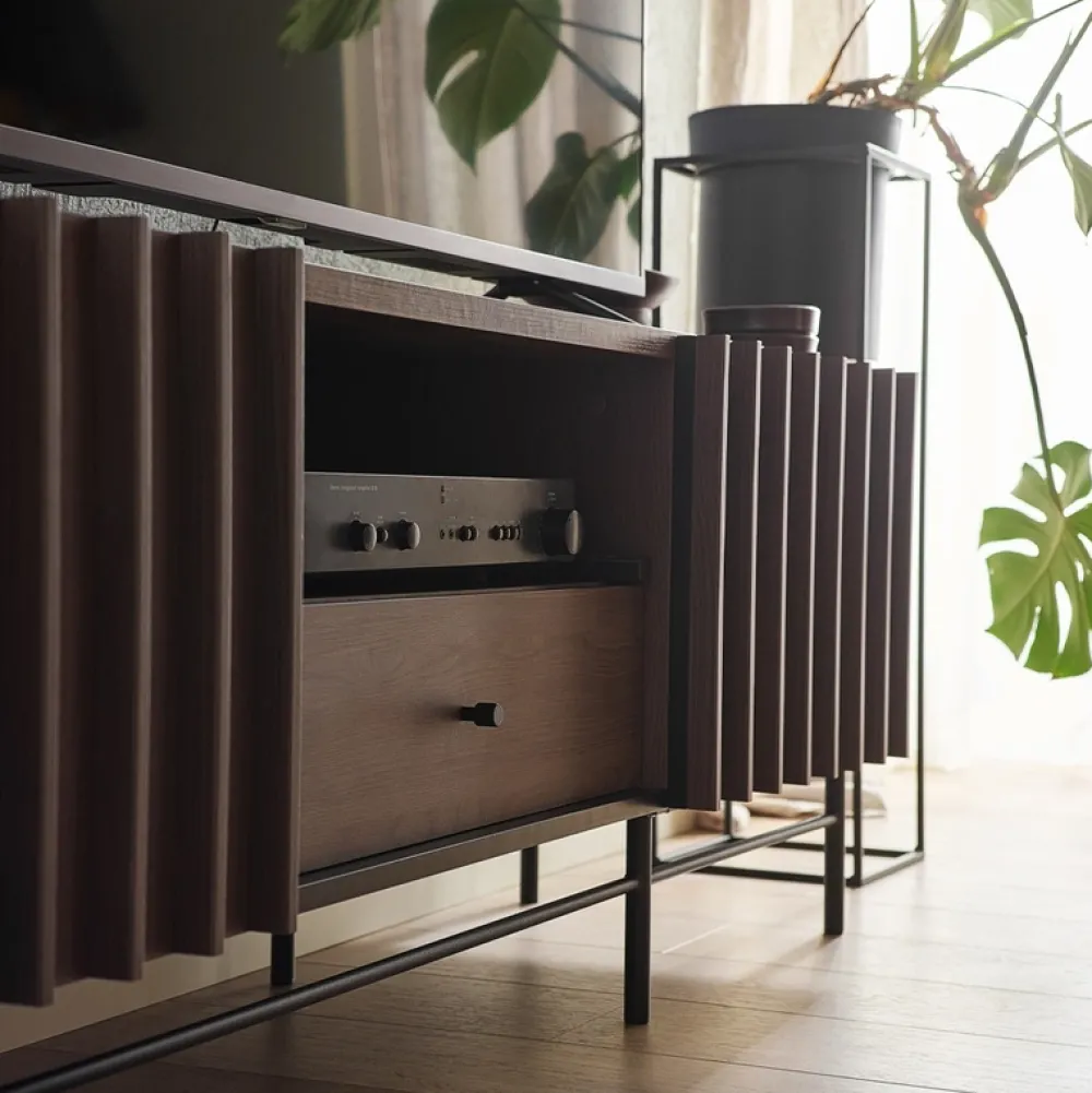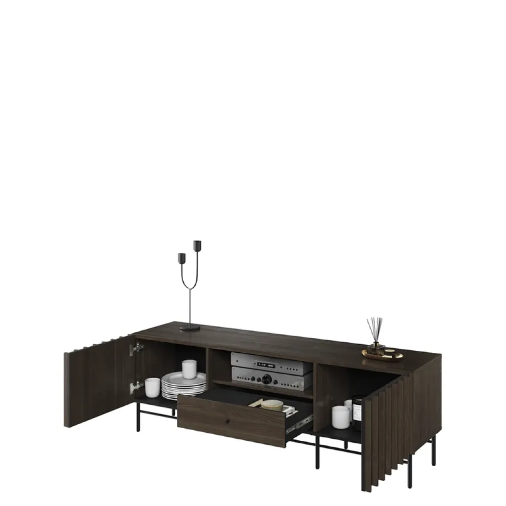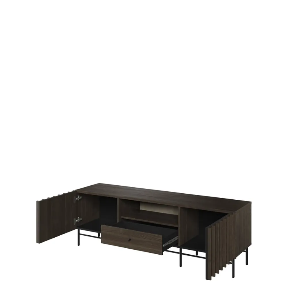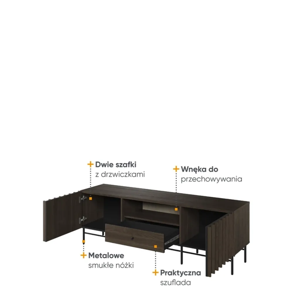 Fronty z lamelami dodają meblowi nowoczesnej, a zarazem ciepłej i przytulnej atmosfery. Nowoczesna szafka RTV wyposażona jest w praktyczną szufladę na prowadnicy kulkowej, która zapewnia płynne i ciche otwieranie, a także długą żywotność, nawet przy częstym użytkowaniu. Zawiasy puszkowe zapewniają bezproblemowe otwieranie i zamykanie frontów, gwarantując ich trwałość.