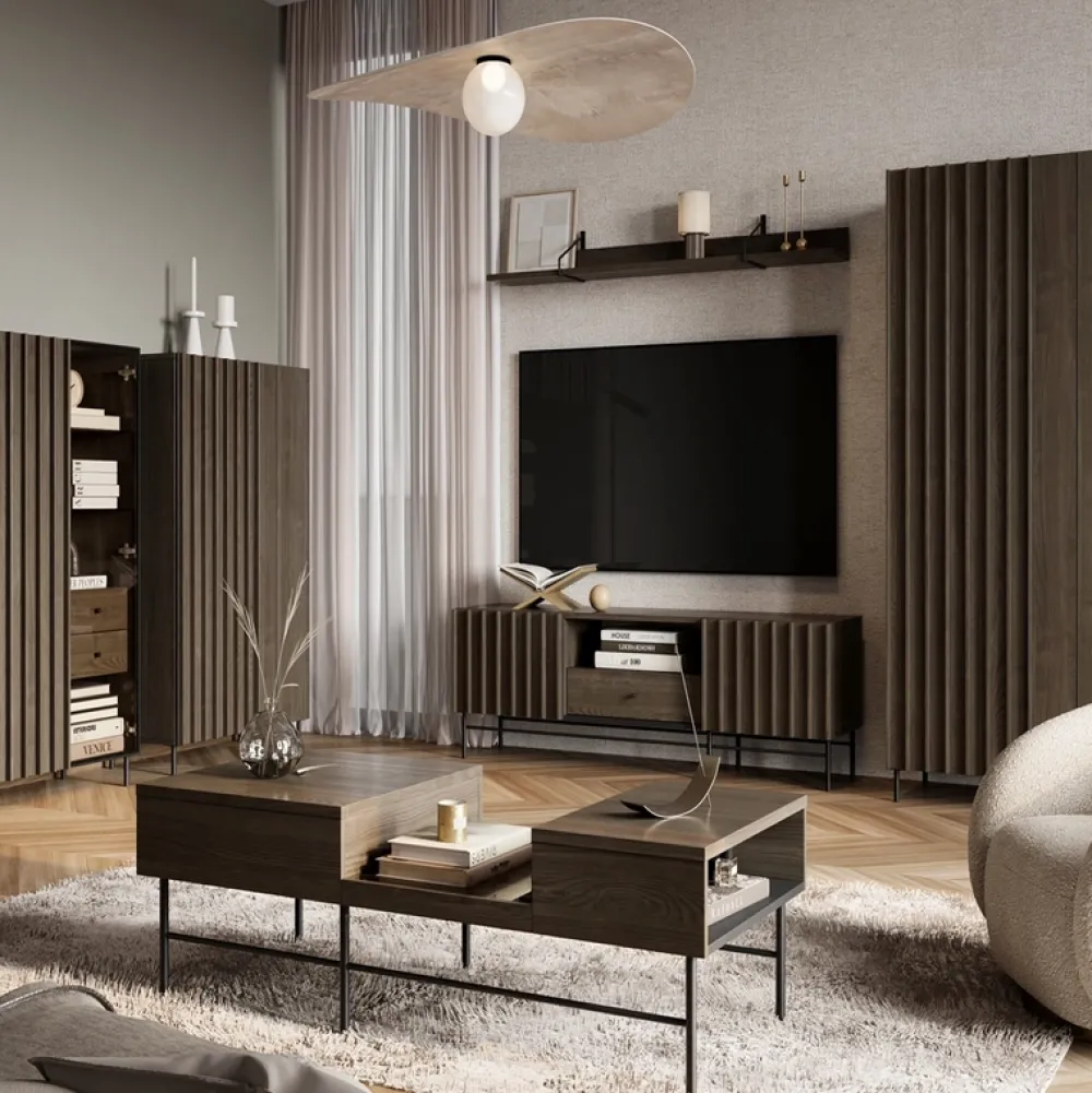 Podsumowując, ta nowoczesna szafka RTV z lamelami do salonu jest doskonałym meblem dla każdego, kto ceni funkcjonalność i styl. Jej wysokiej jakości materiały i przemyślane detale zapewniają, że będzie służyła przez wiele lat.
