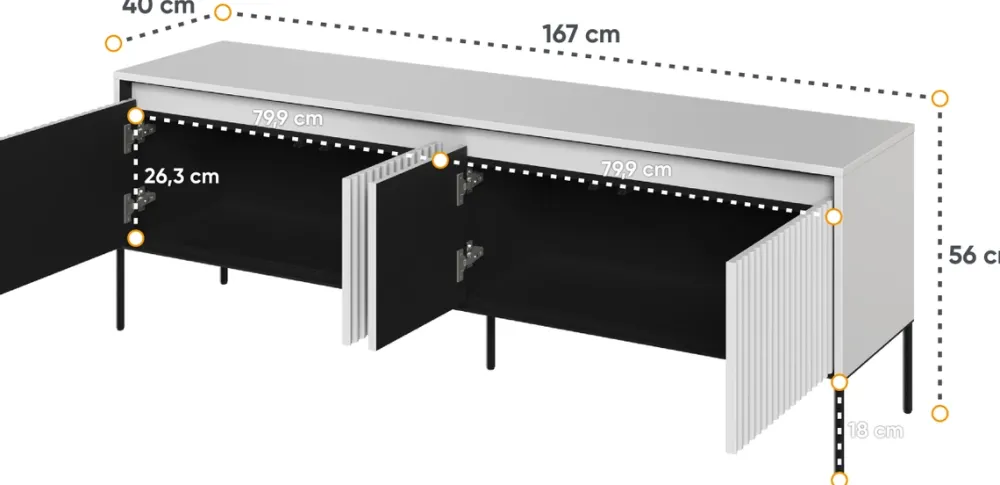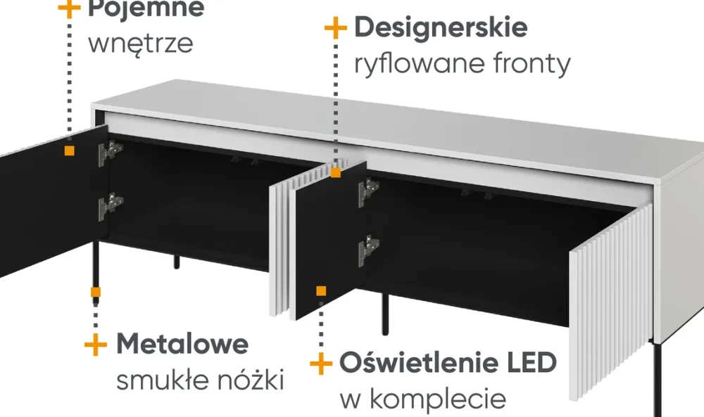 Podkreśl elegancję swojego salonu z naszą nowoczesną szafką RTV TREND o szerokości 167 cm. Wybór każdego miłośnika estetycznej formy i funkcjonalności, szafka RTV osadzona na wysokich metalowych nóżkach, wnosi do Twojego wnętrza wyrafinowany, nowoczesny styl.