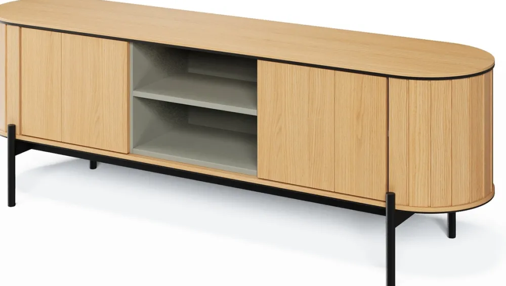 - Fronty szafki RTV otwierają się dzięki systemowi push to open, więc wystarczy jedno dotknięcie, żeby otworzyć szafkę RTV.