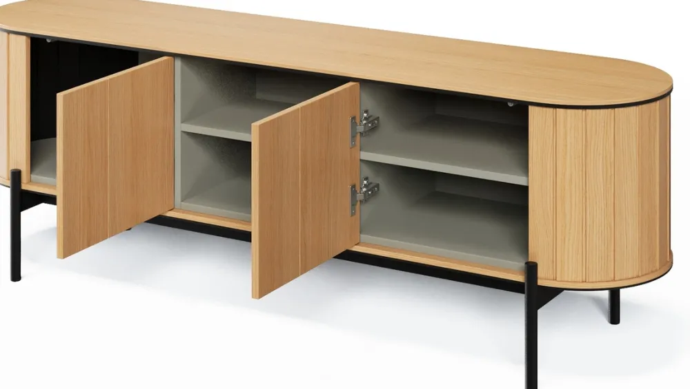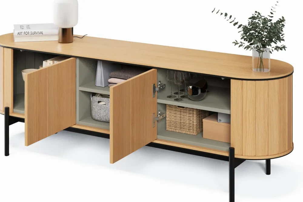 - Za każdymi z drzwi komody znajdują się dwie praktyczne półki.