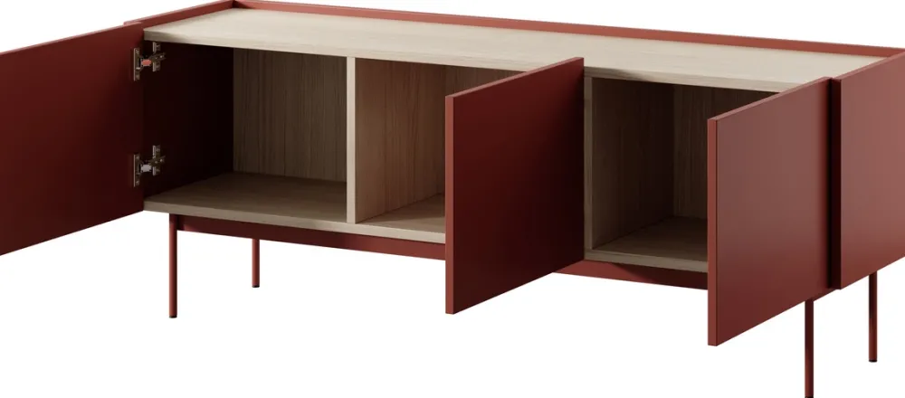 Szafka RTV została wyposażona w trzy drzwi z mechanizmem cichego domyku, które zapewniają bezgłośne i płynne otwieranie. Dzięki temu użytkowanie jest wyjątkowo komfortowe, a mechanizmy wewnętrzne pozostają chronione przed nadmiernym zużyciem. Drzwi otwierają się za krawędź, eliminując potrzebę wystających uchwytów, co podkreśla nowoczesny charakter mebla.