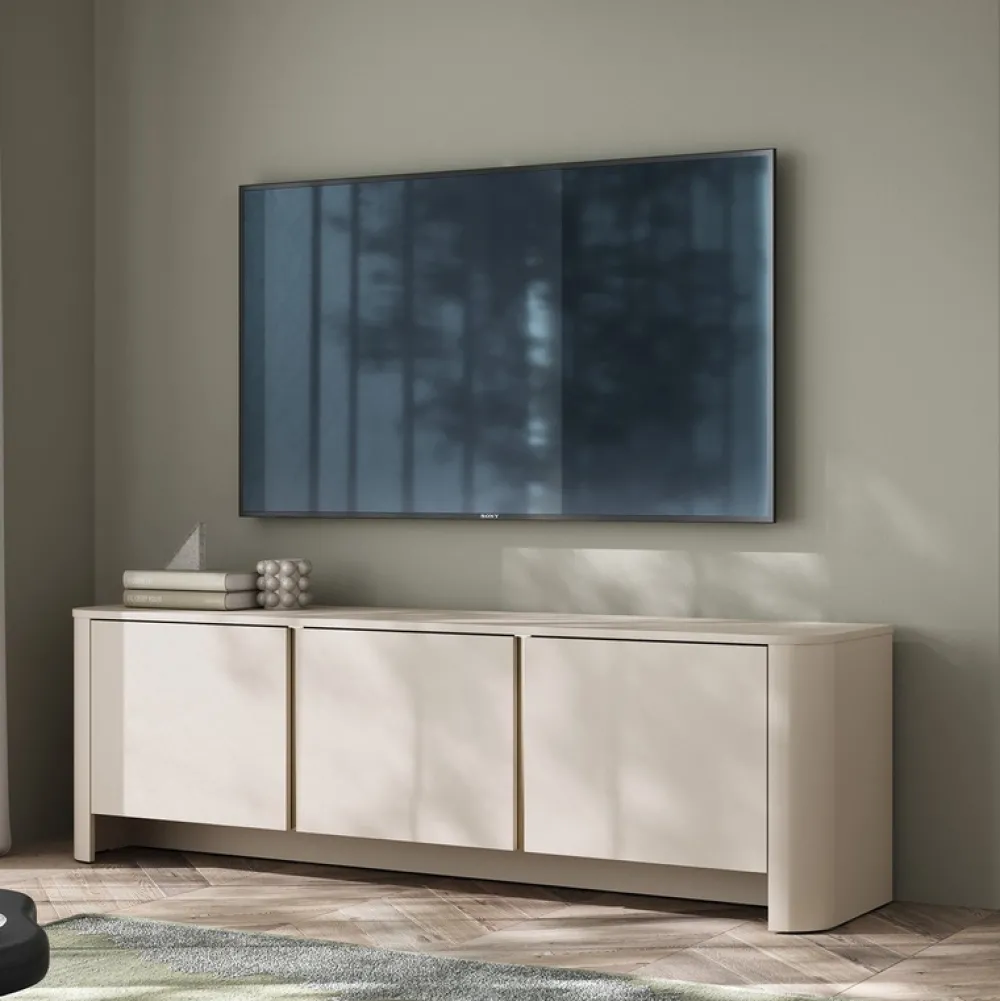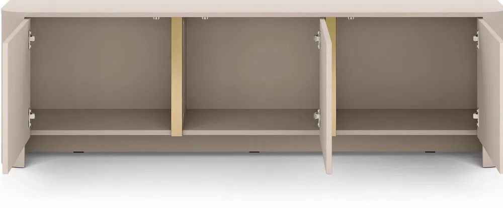 Szafka RTV z kolekcji BELVI to minimalistyczna forma i subtelna elegancja zamknięte w nowoczesnym odcieniu kaszmiru. Dzięki zaokrąglonym bokom i złotym akcentom mebel doskonale wpisuje się w styl premium, tworząc harmonijną przestrzeń w każdym salonie. Trzy zamknięte komory pomieszczą sprzęt i akcesoria, pomagając utrzymać porządek bez kompromisu w estetyce.