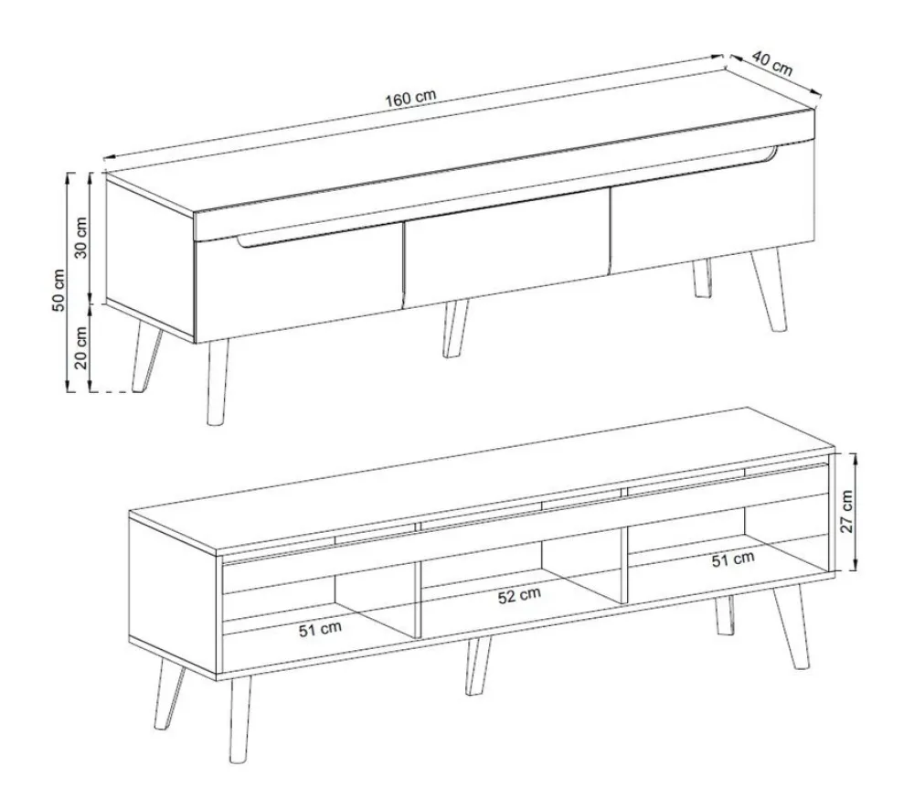 - Szafka RTV w stylu skandynawskim wyposażona w trzy szuflady pracujące na prowadnicach kulkowych z pełnym wysuwem. Szafka osadzona na drewnianych nóżkach barwionych na kolor czarny.