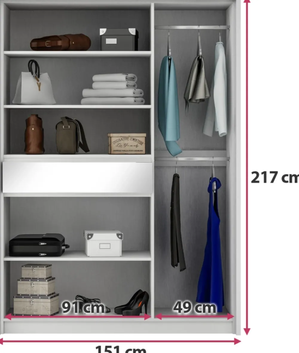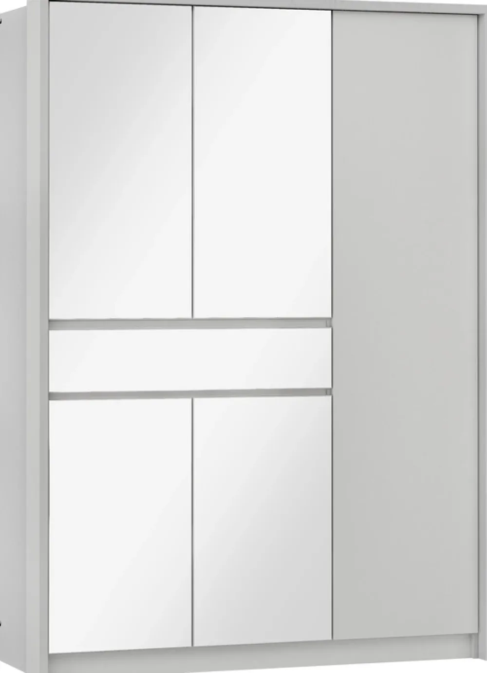 - Biała szafa z lustrem 150 cm SPARK posiada pięć drzwi uchylnych oraz szufladę, za drzwiami po lewej stronie znajdują się półki na ubrania i akcesoria, natomiast za drzwiami po prawej stronie swoje miejsce znalazły dwa aluminiowe drążki na wieszaki.