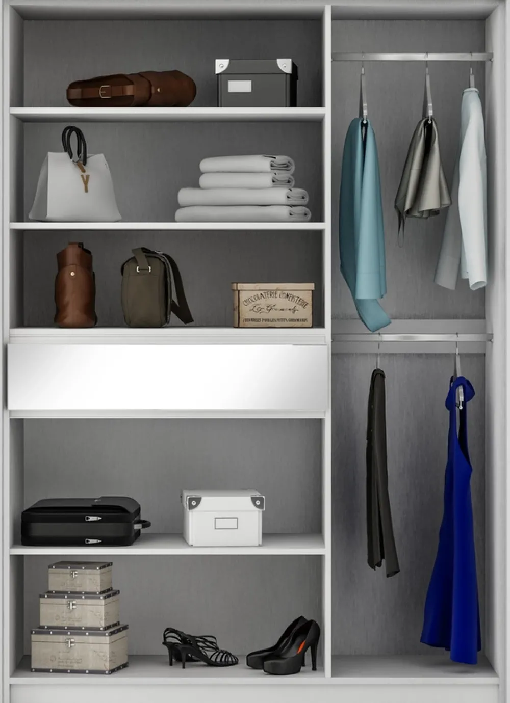Za prawymi drzwiami znajdują się dwa drążki na wieszaki, które idealnie sprawdzą się do przechowywania sukienek, koszul czy płaszczy. Dzięki temu każdy element garderoby ma swoje miejsce, co ułatwia jej organizację.