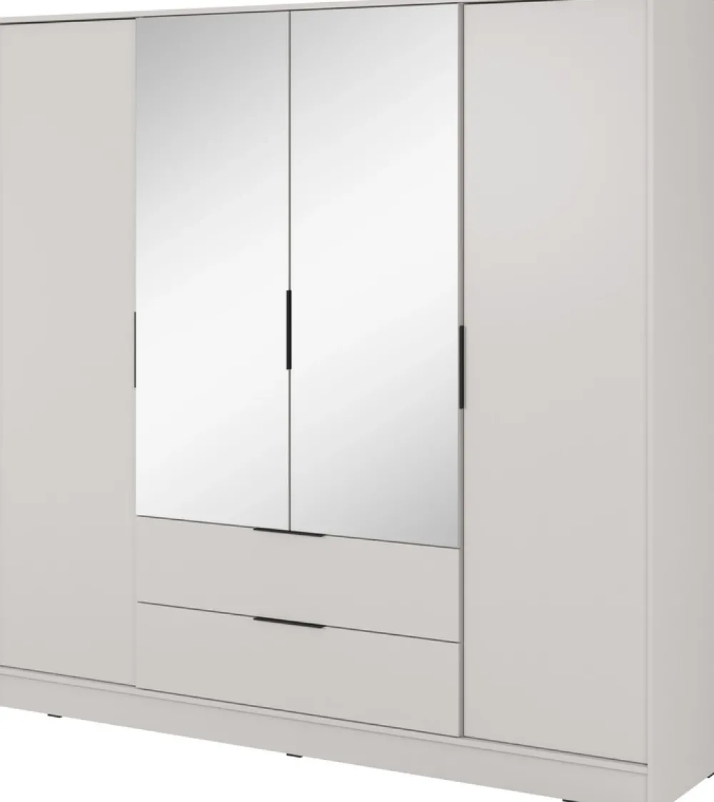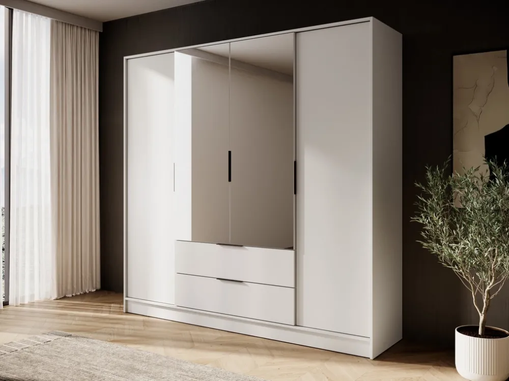 - Szafa uchylna z lustrem 206 cm KAMIS posiada drzwi po prawej i lewej stronie, za którymi znajdują się półki. Za drzwiami z lustrem skrywa się aluminiowy drążek na wieszaki. Dwie szuflady na prowadnicach kulkowych gwarantują płynną pracę.