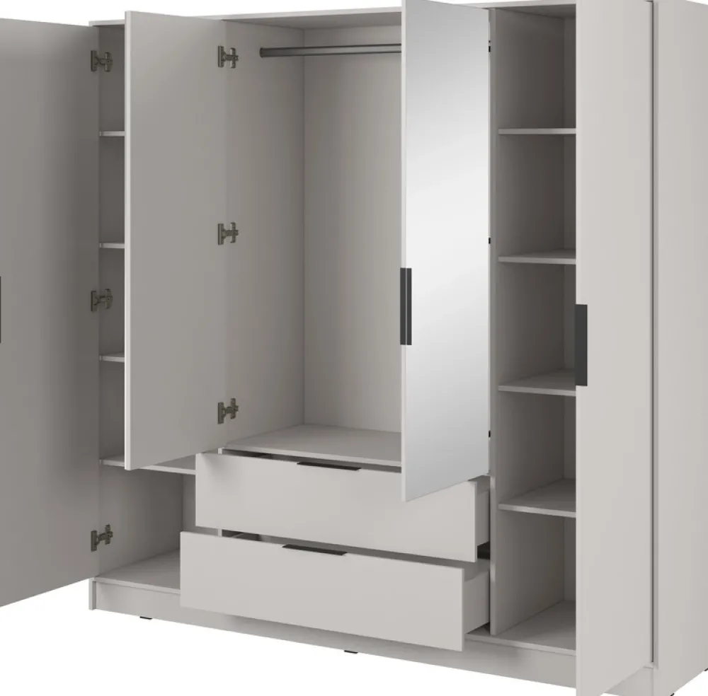 Szafa z lustrem KAMIS to idealne połączenie stylu i praktyczności, które doskonale odnajdzie się w każdym wnętrzu. Przestronny układ pozwala na uporządkowane przechowywanie ubrań i dodatków, zapewniając wygodny dostęp do wszystkich rzeczy. Po prawej i lewej stronie znajdują się drzwi, za którymi kryje się po pięć solidnych półek – idealnych na ubrania, pościel, czy inne niezbędne akcesoria.