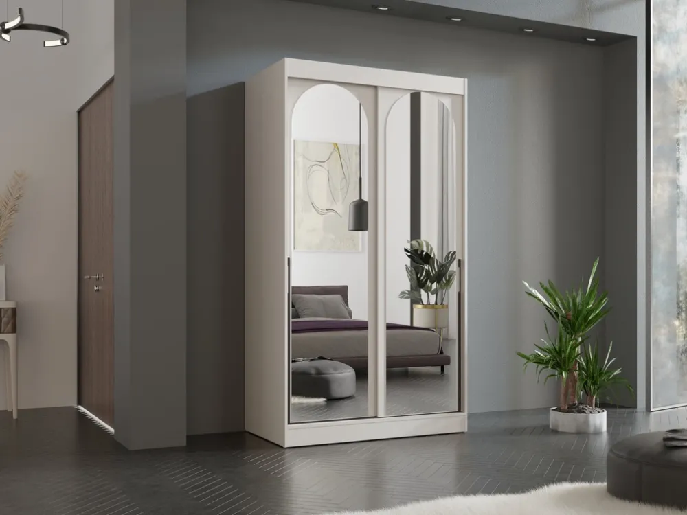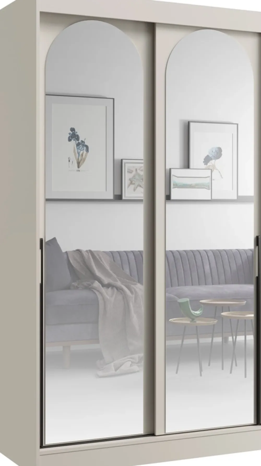 - Kaszmirowa szafa MORIN 120 cm z lustrami o łukowym wykończeniu, systemem przesuwnym LAGUNA oraz uchwytami w kolorze czarnym. Duża pojemność i elegancki design do każdego wnętrza.