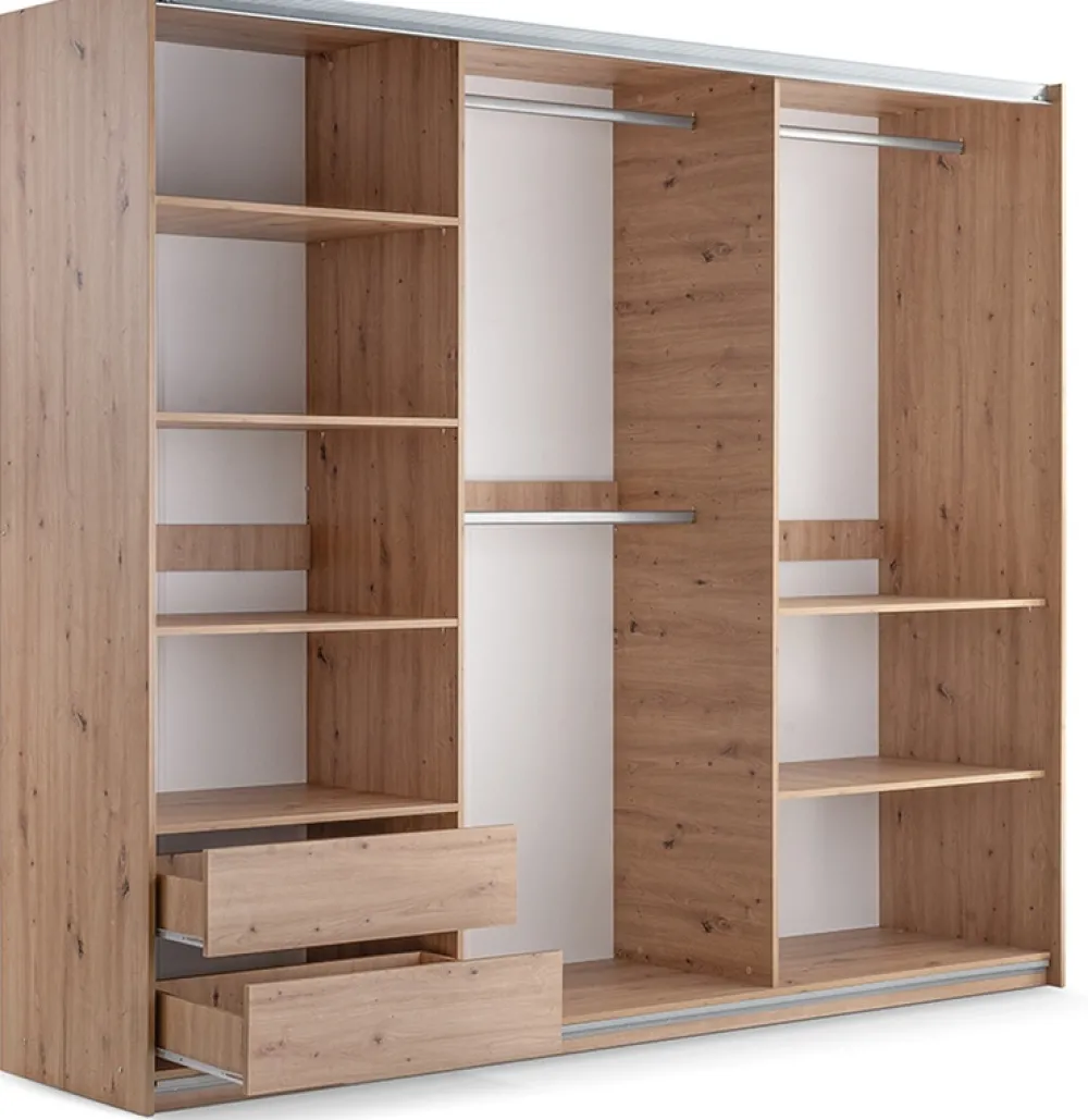 - Pojemna szafa przesuwna SAVINA 250 cm w kolorze dąb artisan z lustrem i ozdobnymi lamelami to nowoczesne i praktyczne rozwiązanie do sypialni. Posiada pojemne półki, drążki na wieszaki i dwie szuflady, idealne do codziennego przechowywania.