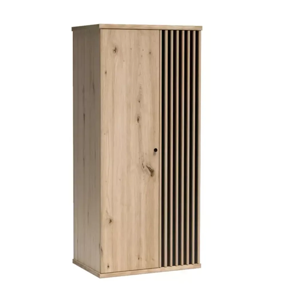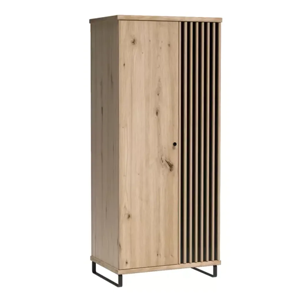 Szafa CALIS to propozycja, która dzięki swojej stylistyce sprawdzi się zarówno we współczesnych aranżacjach sypialni, jak i salonie. Szafa została wyposażona w trzy półki, które kryją się za stylowymi lamelami oraz praktyczny drążek na wieszaki, nad którym znajduje się półka. Szafa dzięki przemyślanej konstrukcji mimo swoich stosunkowo niewielkich rozmiarów jest bardzo pojemna.