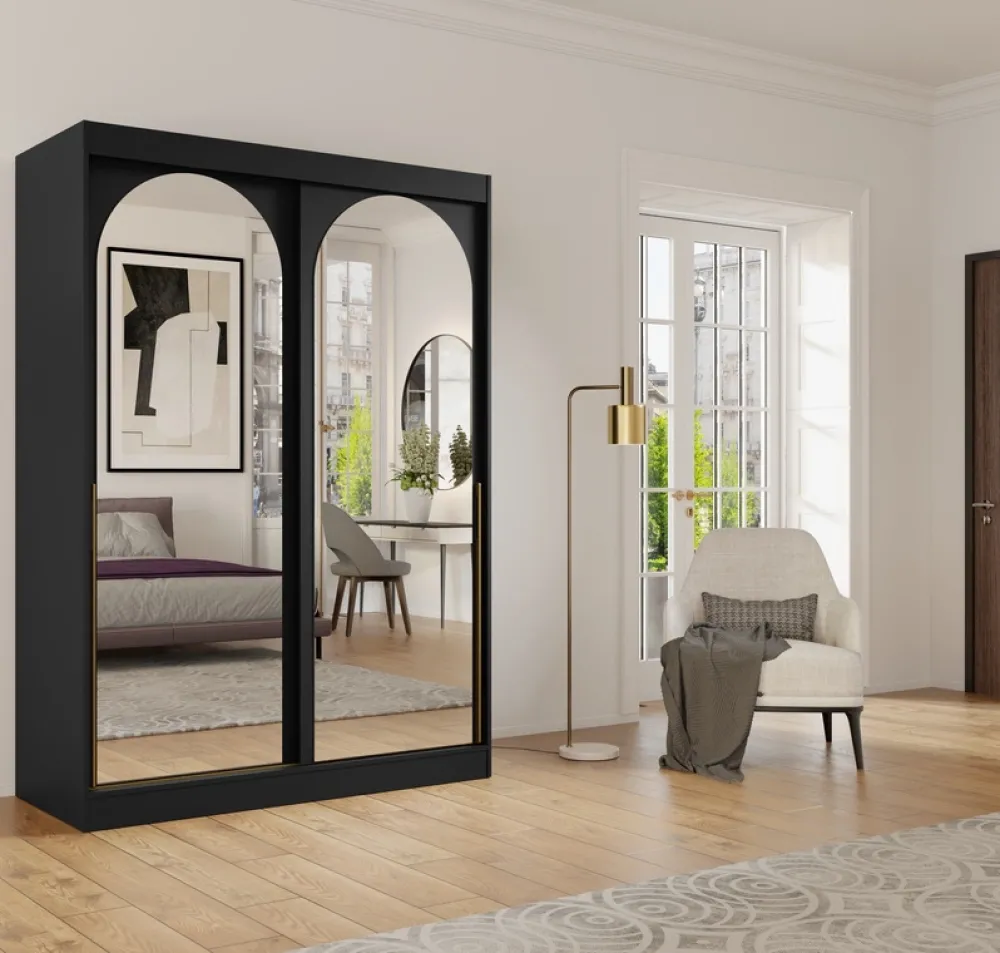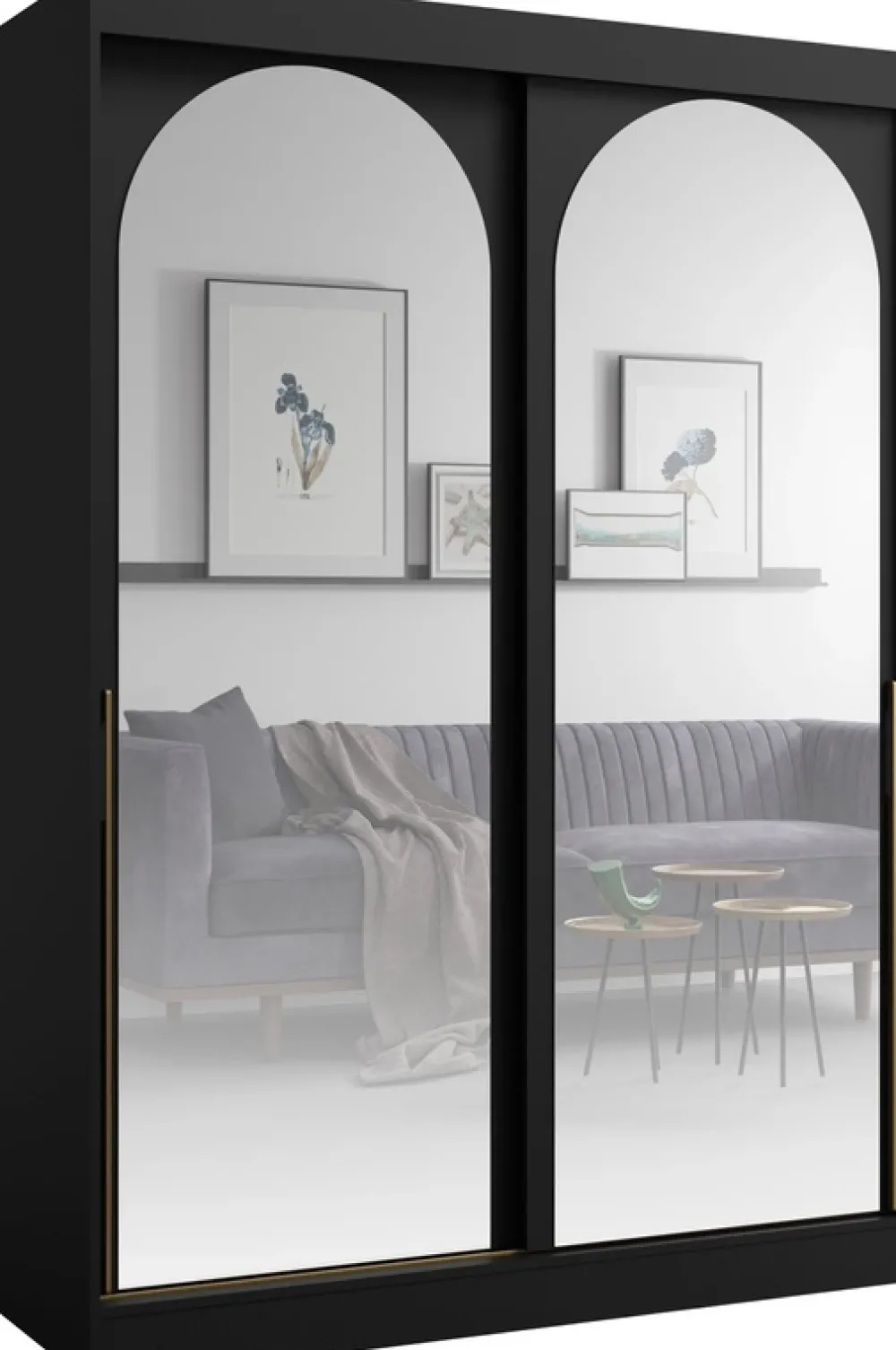 Szafa MORIN to propozycja dla tych, którzy cenią minimalistyczny design połączony z funkcjonalnością. Czarne fronty z efektownymi lustrami o łukowym wykończeniu dodają wnętrzu przestronności i światła, a system przesuwny zapewnia wygodne użytkowanie nawet w mniejszych pomieszczeniach. Idealna do sypialni, garderoby czy przedpokoju – wszędzie tam, gdzie liczy się styl i porządek.