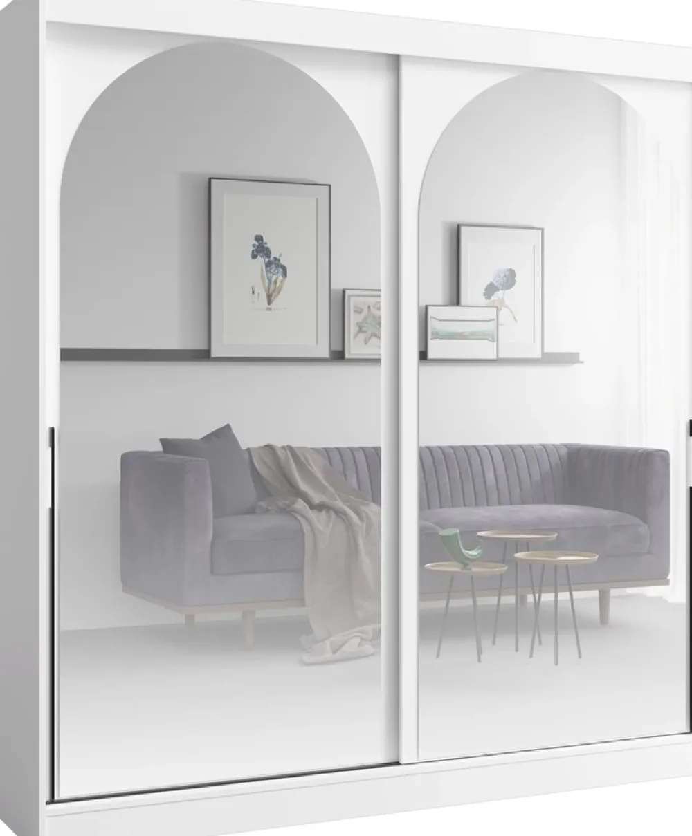 Szafa MORIN to propozycja dla tych, którzy cenią minimalistyczny design połączony z funkcjonalnością. Białe fronty z efektownymi lustrami o łukowym wykończeniu dodają wnętrzu przestronności i światła, a system przesuwny zapewnia wygodne użytkowanie nawet w mniejszych pomieszczeniach. Idealna do sypialni, garderoby czy przedpokoju – wszędzie tam, gdzie liczy się styl i porządek.