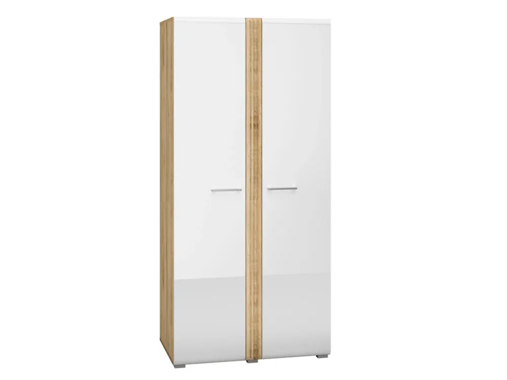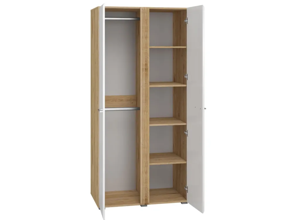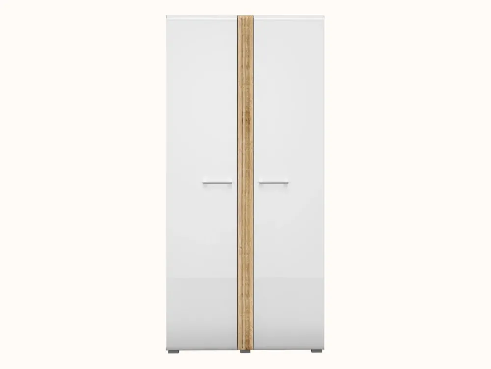 - Szafa dwudrzwiowa ADAGIO posiada białe fronty w kolorze białego połysku oraz frezowaną wstawkę między drzwiami. Wewnątrz szafy znajdują się dwa aluminiowe drążki na wieszaki oraz pięć półek po prawej stronie. Chromowane uchwyty wykonane z metalu.