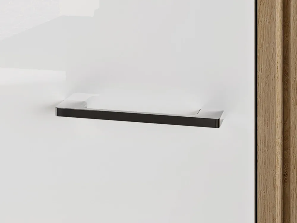 - Uchwyty zostały wykonane z metalu w kolorze chromu. Elegancki kształt doskonale komponuje się z całokształtem mebla.