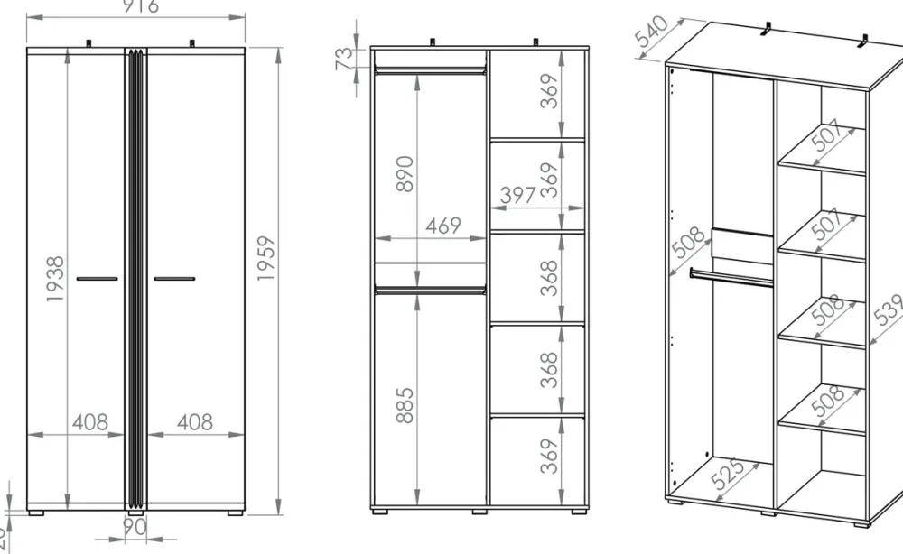 Po prawej stronie szafy znajduje się pięć przestronnych półek. To idealne miejsce na przechowywanie złożonych ubrań, butów, torebek czy innych akcesoriów. Każda półka została zaprojektowana z myślą o trwałości i wytrzymałości, co pozwala na przechowywanie nawet cięższych przedmiotów bez obawy o ich stabilność.