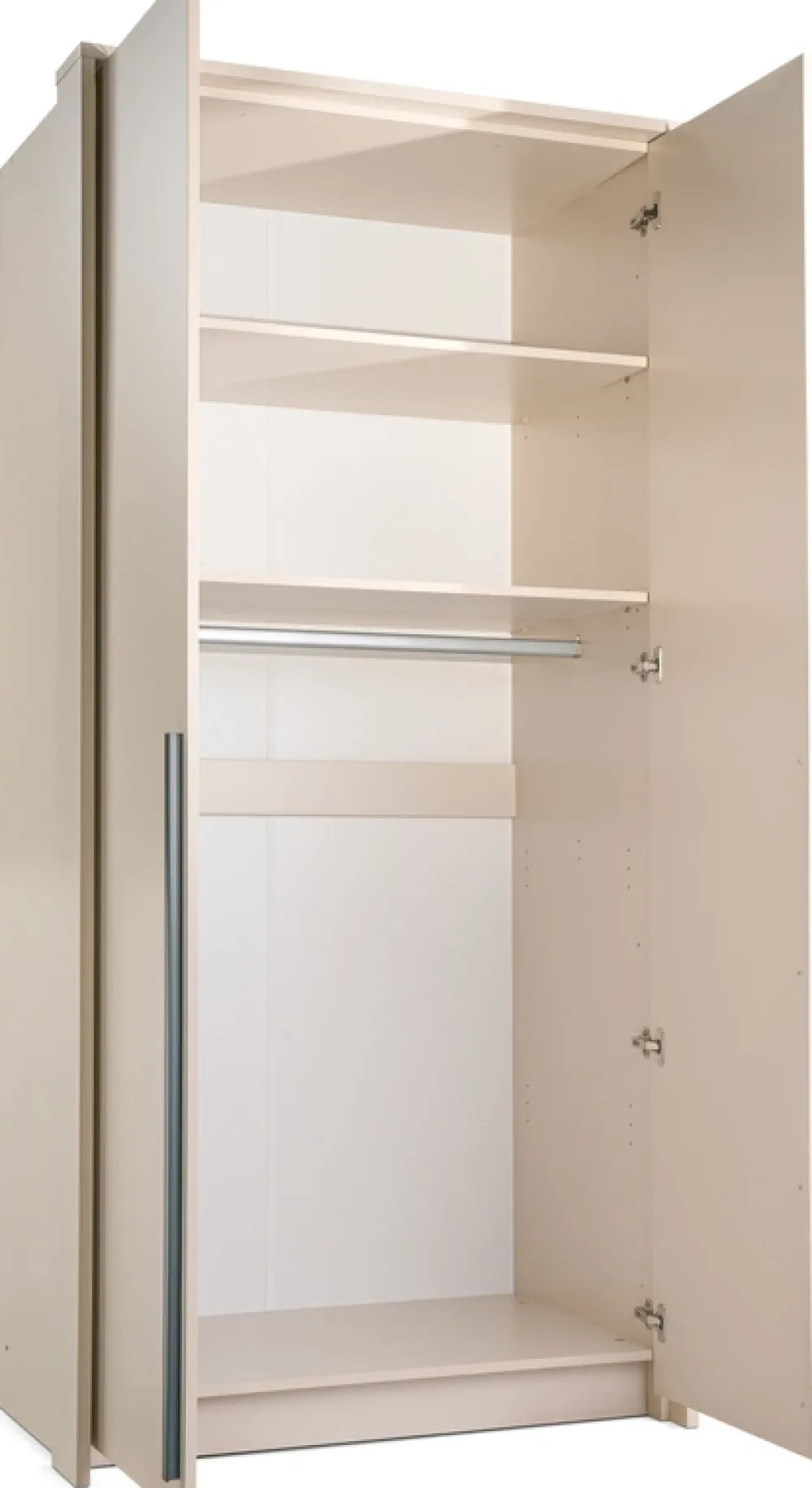 Za drzwiami znajduje się jedna przestrzeń z drążkiem na wieszaki oraz dwie pojemne półki – idealne do przechowywania poskładanych ubrań, ręczników czy dodatków. Drążek z aluminium pozwala na wygodne organizowanie odzieży wiszącej, takiej jak sukienki, koszule czy płaszcze. Taki układ zapewnia porządek i wygodę w codziennym użytkowaniu.