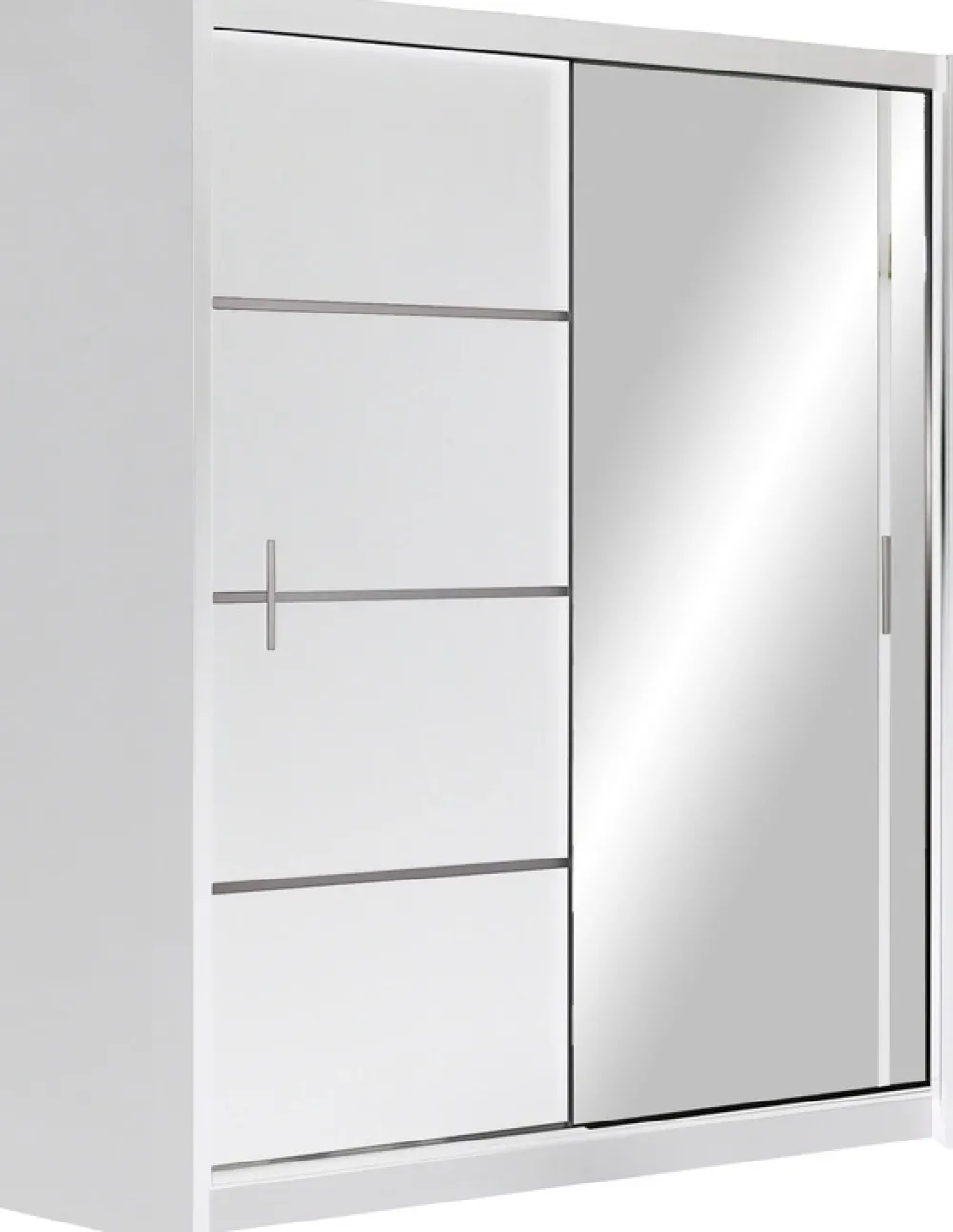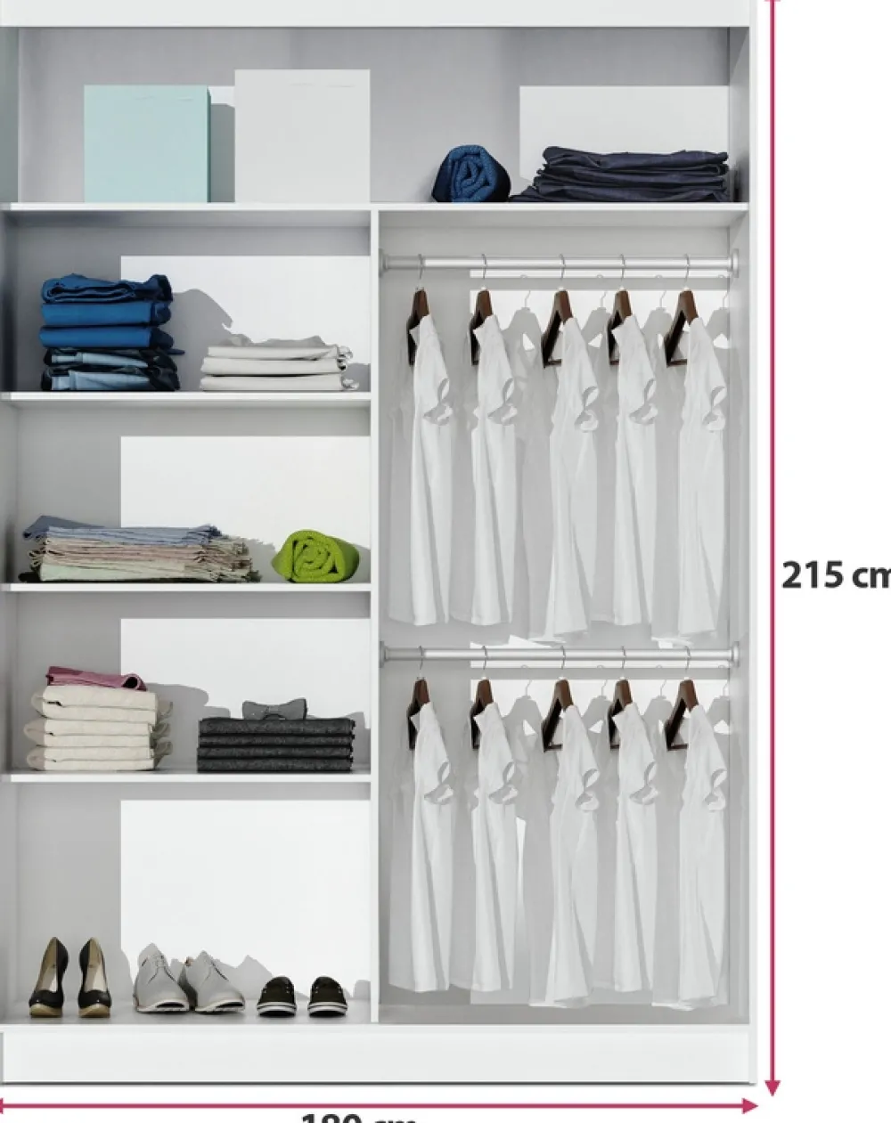 - Dwudrzwiowa szafa przesuwna 180 cm VOTIS posiada pięć półek na ubrania po lewej stronie, oraz półkę i dwa drążki na wieszaki za prawymi drzwiami. Nowoczesna stylistyka sprawia, że szafa doskonale wpisuje się we współczesne aranżacje pomieszczeń.