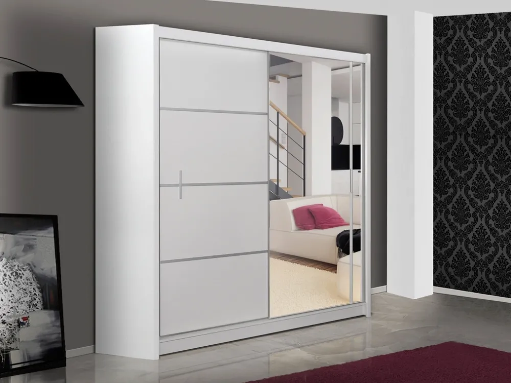Szafa przesuwna o szerokości 180 cm VOTIS to eleganckie i praktyczne rozwiązanie, które doskonale sprawdzi się w każdej sypialni czy garderobie. Jej przemyślany układ wnętrza oraz nowoczesny design sprawiają, że jest to mebel nie tylko funkcjonalny, ale również stylowy, wprowadzający do wnętrza nutę nowoczesności.