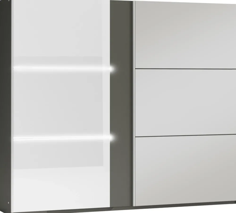- Szafa przesuwna 250 cm TOSSA posiada dwie szuflady oraz cztery półki po lewej stronie, dwa drążki na wieszaki w centralnej części oraz drążek i trzy półki po prawej stronie. Prawe drzwi szafy zdobi duże lustro, natomiast lewa strona posiada podświetlenie.