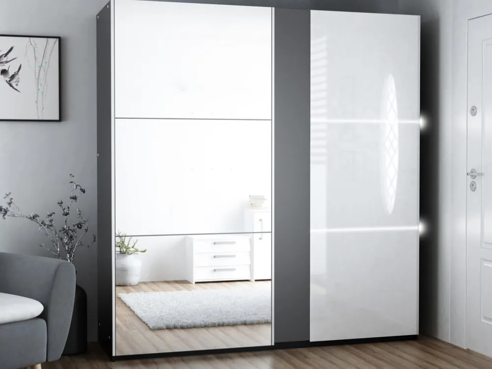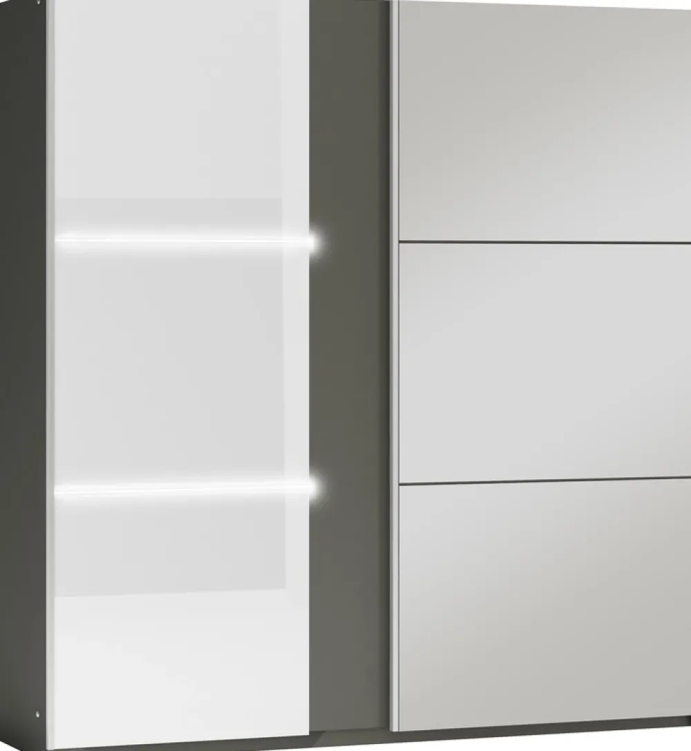 - Dwudrzwiowa szafa przesuwna z lustrem TOSSA posiada pięć półek na ubrania po lewej stronie oraz dwa aluminiowe drążki na wieszaki za prawymi drzwiami, które zostały wzbogacone o lustro. Front szafy posiada zdobiące mebel oświetlenie LED.