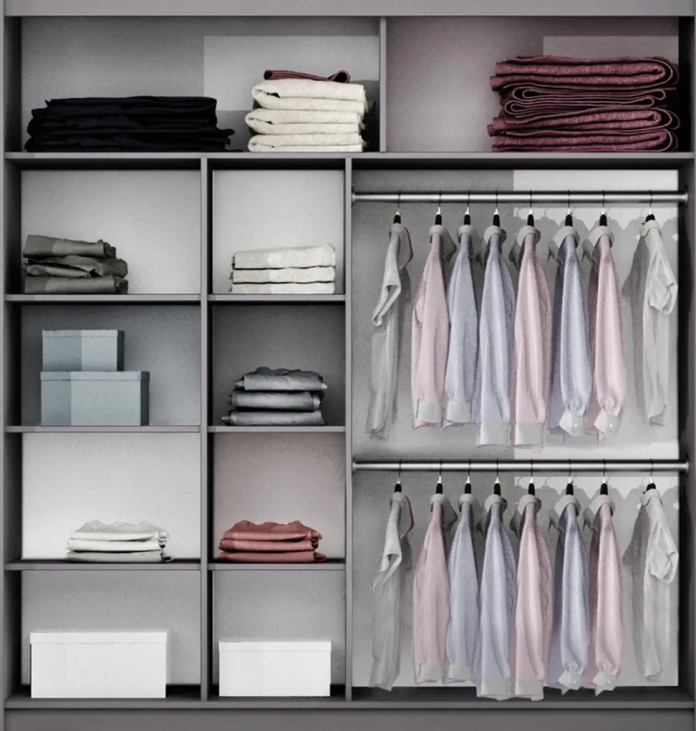 Po prawej stronie szafy umieszczono dodatkową półkę oraz dwa drążki na wieszaki, idealne do przechowywania odzieży wiszącej, takiej jak marynarki, sukienki czy płaszcze. Drążki zapewniają odpowiednią przestrzeń, dzięki czemu ubrania nie ulegają zagnieceniom i zawsze są gotowe do założenia.
