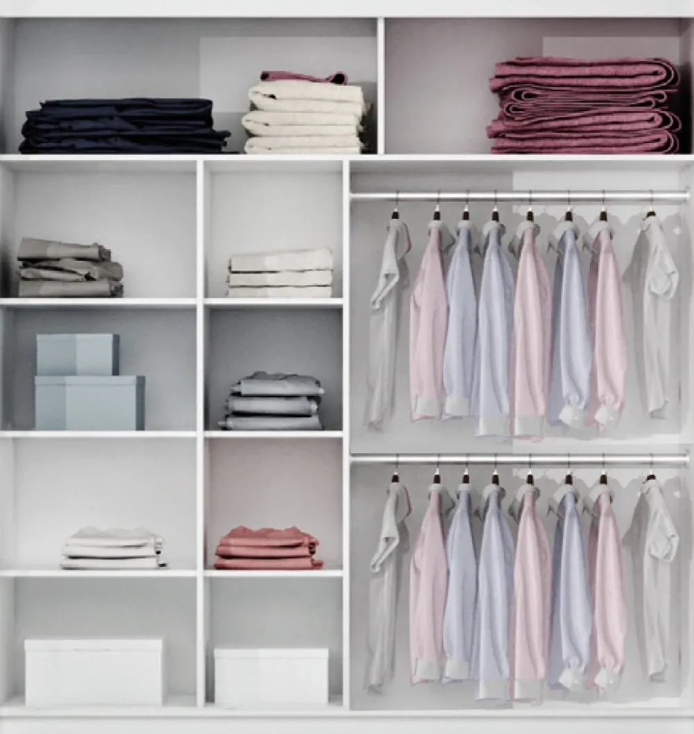 Po prawej stronie szafy umieszczono jedną dodatkową półkę oraz dwa drążki na wieszaki. Drążki są idealnym rozwiązaniem do przechowywania odzieży wiszącej, takiej jak płaszcze, sukienki czy marynarki, zapewniając odpowiednią przestrzeń, by ubrania nie uległy zagnieceniom i były gotowe do noszenia.