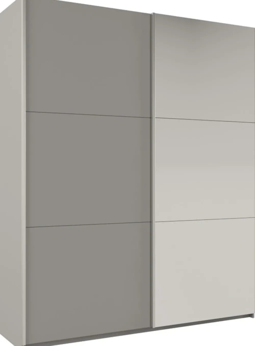 Szafa przesuwna z lustrem o szerokości 200 cm RUBIN to eleganckie i funkcjonalne rozwiązanie, które doskonale sprawdzi się w każdej sypialni lub garderobie. Dzięki drzwiom przesuwnym szafa nie tylko oszczędza przestrzeń, ale także zapewnia wygodny dostęp do wnętrza, co jest szczególnie praktyczne w mniejszych pomieszczeniach. Lustro umieszczone na prawych drzwiach optycznie powiększa pomieszczenie, wprowadzając do niego więcej światła i nadając mu nowoczesny charakter.
